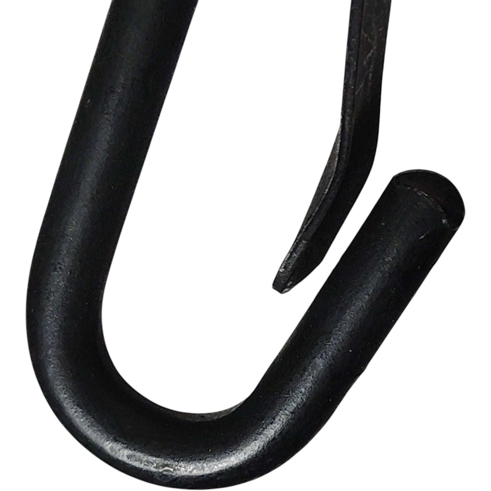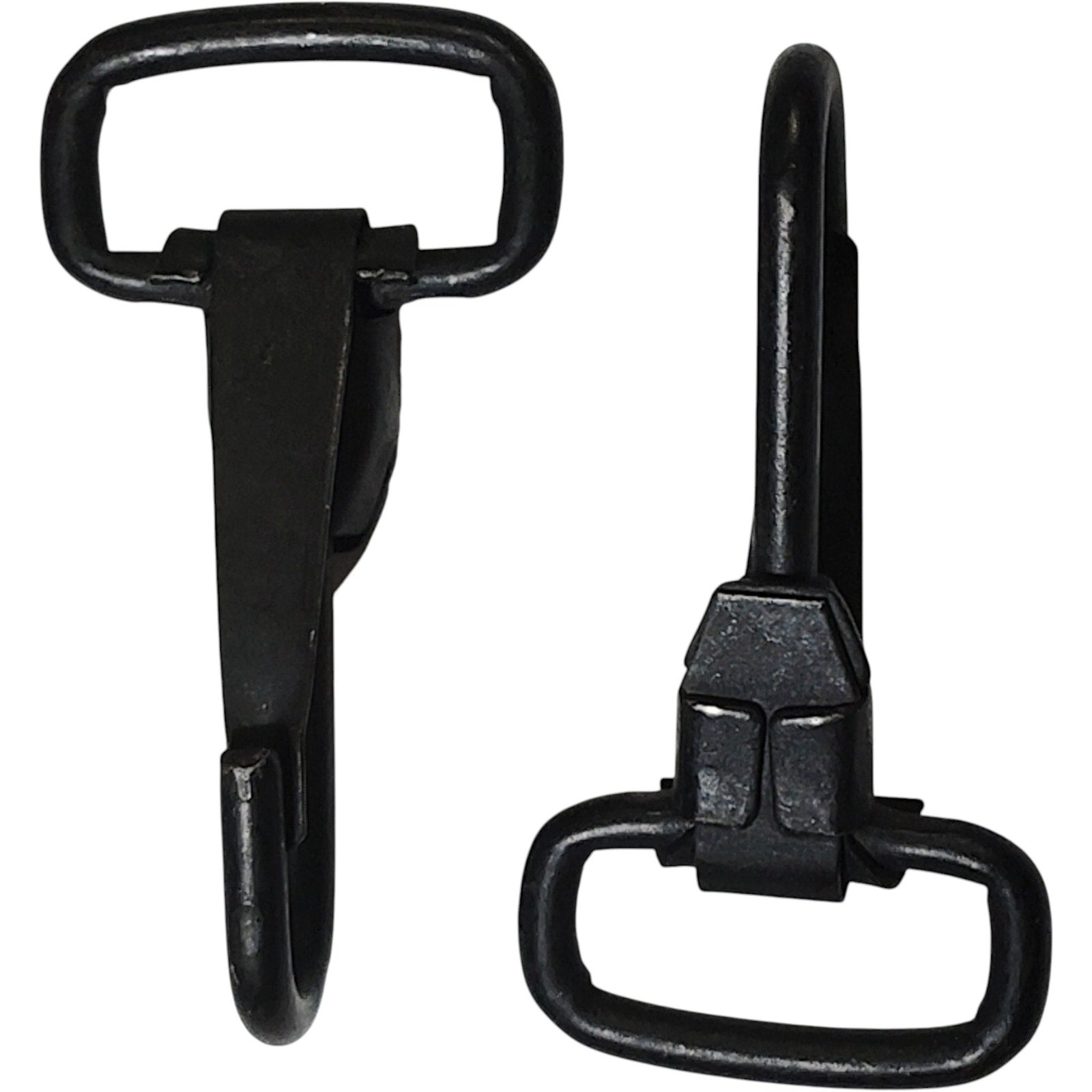 Set of two heavy-duty 1-inch black plated metal snap hooks with fixed rectangular loops, sourced from military surplus. These hooks are ideal for securing gear, straps, or accessories in tactical, outdoor, or industrial applications. The fixed loop design ensures stable attachment to webbing, while the spring-loaded clasp provides quick and secure fastening. Durable black plating offers corrosion resistance and a low-visibility finish suitable for field use. Unused condition, perfect for gear restoration or custom builds.