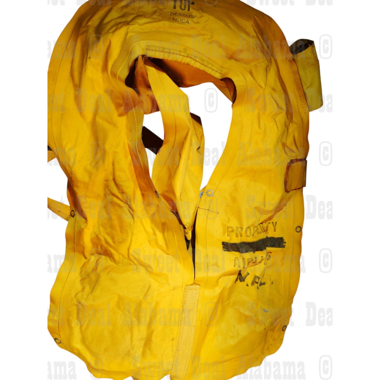 - Material: Yellow rubberized fabric with printed instructions and markings