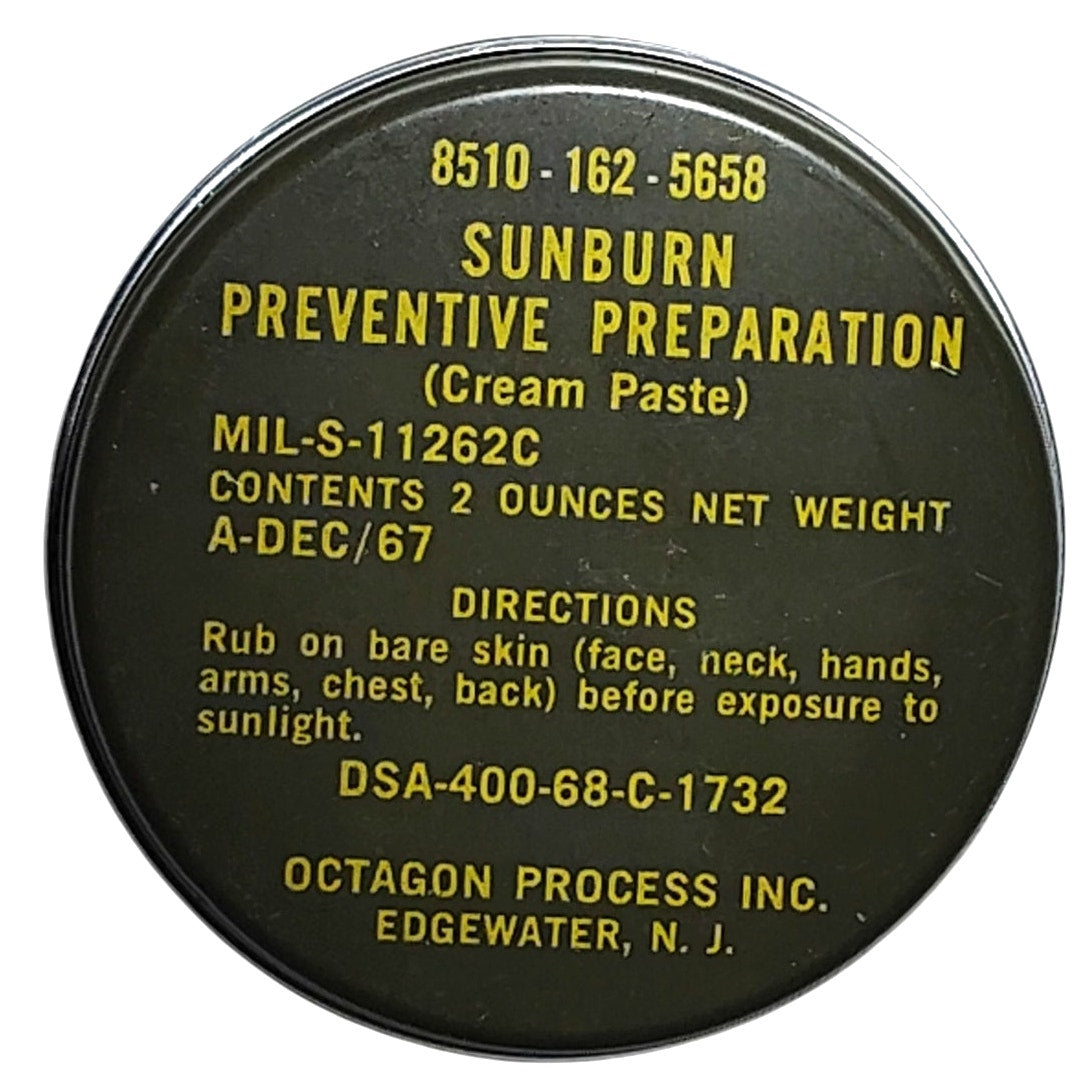 Authentic 1967 U.S. military-issued Sunburn Preventive Preparation in cream paste form, manufactured by Octagon Process Inc., Edgewater, NJ. Issued under contract DSA-400-68-C-1732 and conforming to MIL-S-11262C specifications, this 2oz tin was distributed during the Vietnam War era for field use. Marked with NSN 8510-162-5658 and dated A-DEC/67, the item is a historical artifact intended for collectors and display only. Not for topical use due to age. Preserved in original packaging with minor wear consistent with vintage condition.