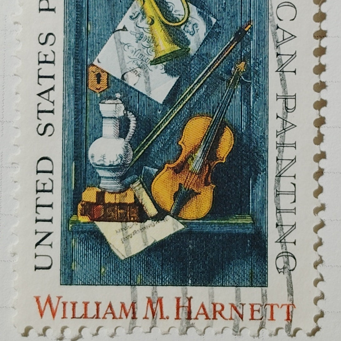 This vintage 1969 United States commemorative stamp is part of the "American Painting" series. The design features a high-quality reproduction of the famous 1892 still life painting "Old Models" by Irish-American artist William M. Harnett. The artwork is renowned for its trompe-l'œil style, depicting a violin, a bugle, and various musical manuscripts.