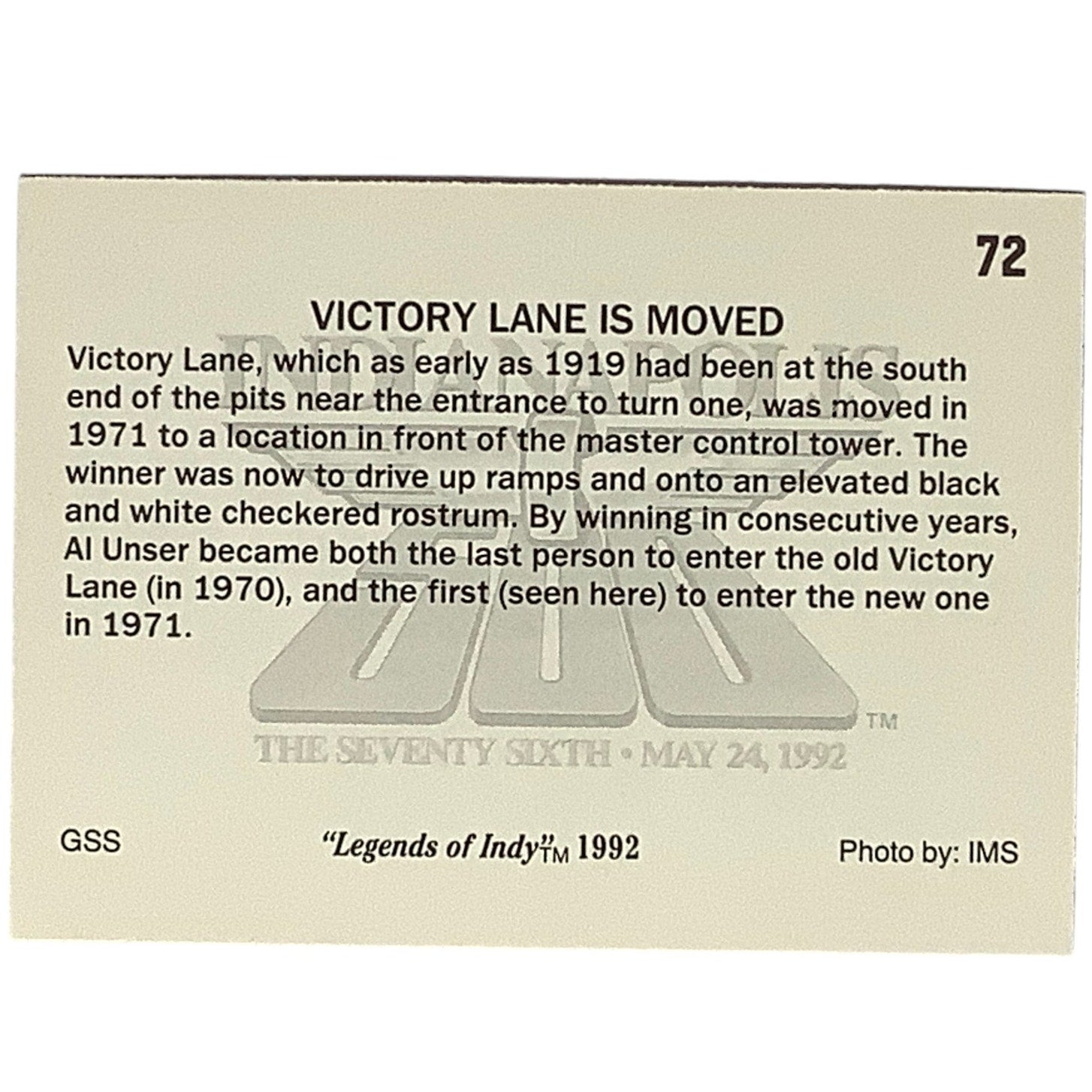 1971 Victory Lane's New Location at the Indy 500, 1992 Legends of Indy, Card 72 NM+