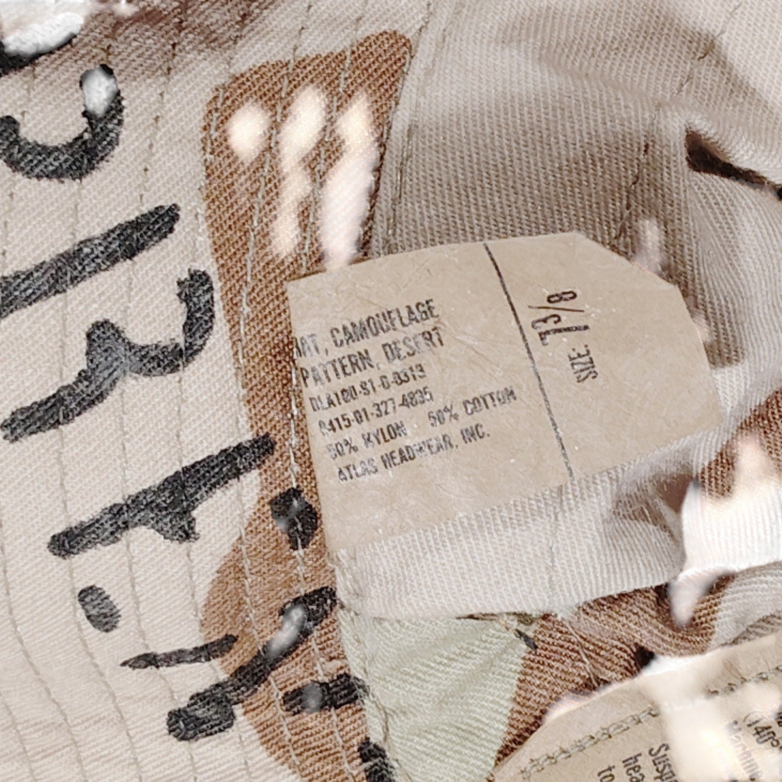 Authentic 1991 U.S. military desert camouflage boonie hat manufactured by Atlas Headwear Inc. under contract DLA100-91-D-0313. Constructed from a durable 50/50 nylon/cotton blend in the desert pattern used during the Gulf War era. NSN 8415-01-327-4835 confirms official issue. Features wide brim, reinforced stitching, vent grommets, and adjustable chin strap loops. Excellent used condition with minimal wear. Ideal for collectors, reenactors, or field use.