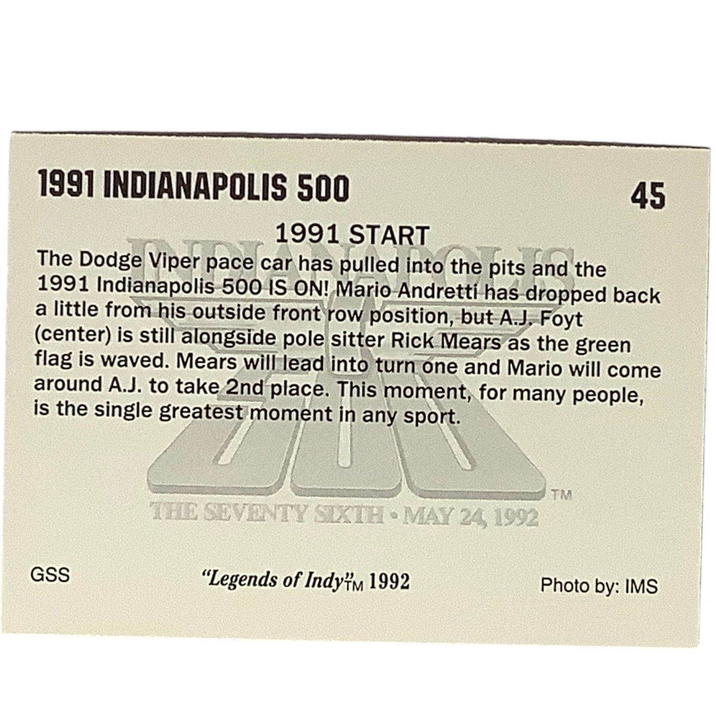1991 Start Indianapolis 500 Race Action, 1992 Legends of Indy Card 45, NM+