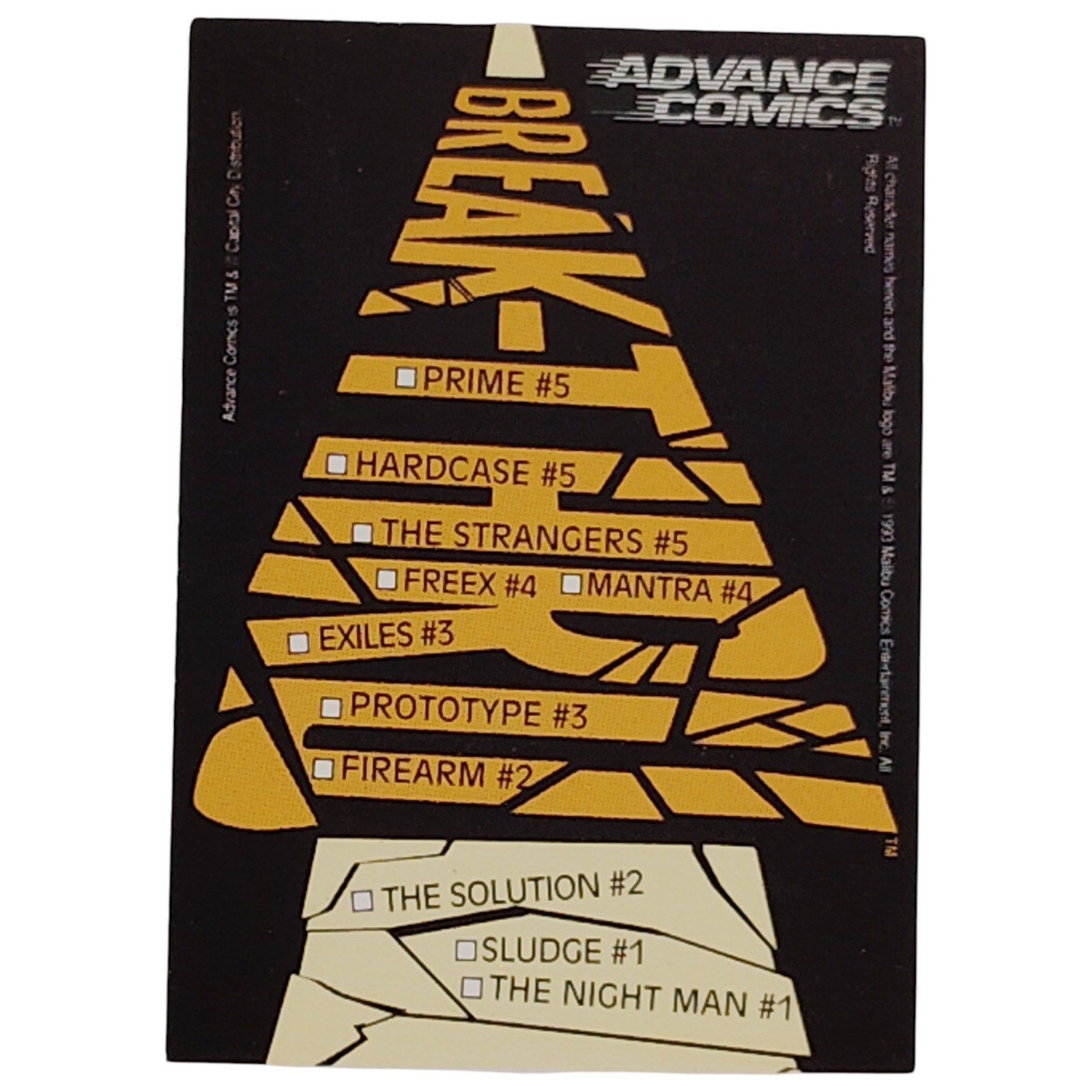 Original 1993 Advance Comics promotional checklist card featuring the Ultraverse and Break-Thru crossover event from Malibu Comics. This card was distributed as part of a retailer preview set, highlighting key titles and characters from the Ultraverse line, including Prime, Hardcase, Mantra, and The Strangers. The checklist includes issue numbers and crossover tie-ins for the Break-Thru storyline, Malibu’s first major shared-universe event. A rare piece of comic book marketing history, this card is in Excellent to Like New (LN) condition and ideal for collectors of 90s indie comics and Ultraverse memorabilia.