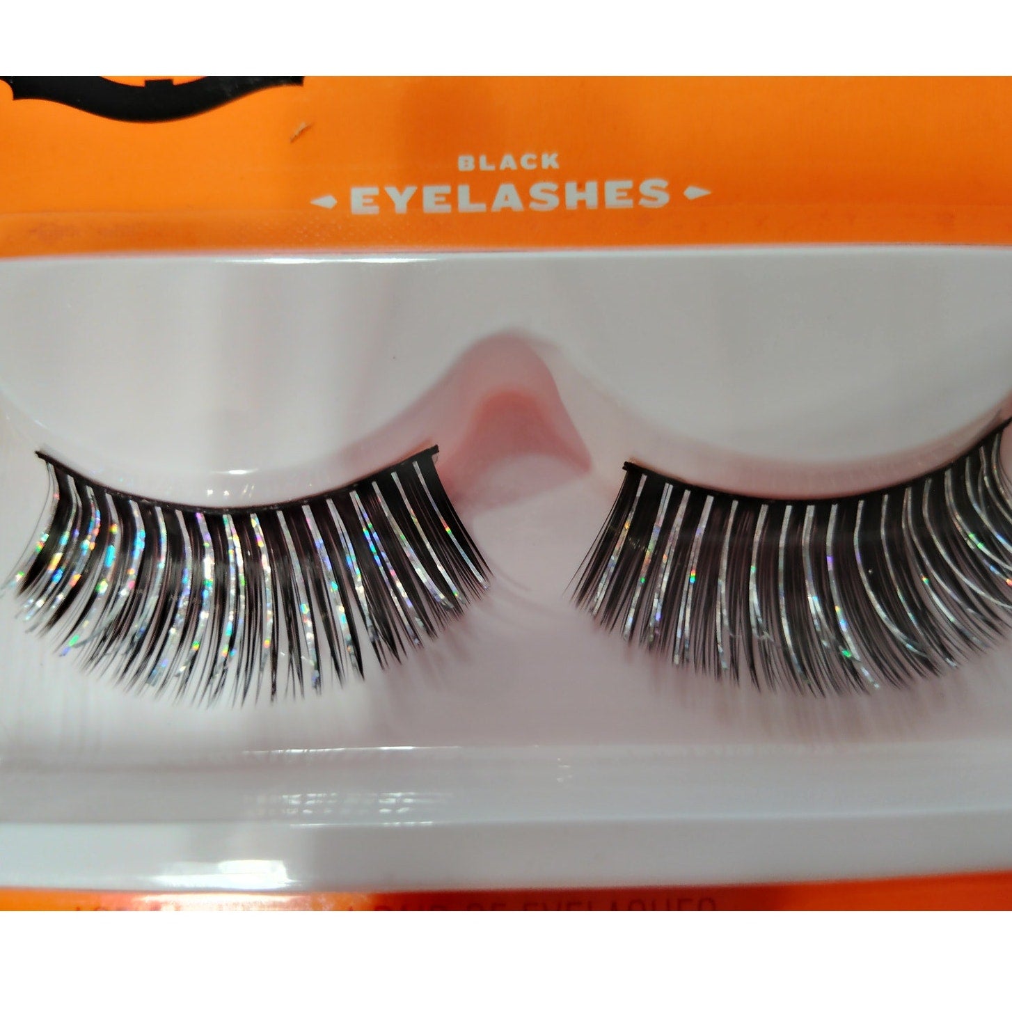 Set of two festive costume eyelash pairs featuring glittery blue and silver accents. Designed for Halloween makeup looks with self-adhesive backing for easy application. Lightweight and flexible for comfortable wear throughout parties or events.
