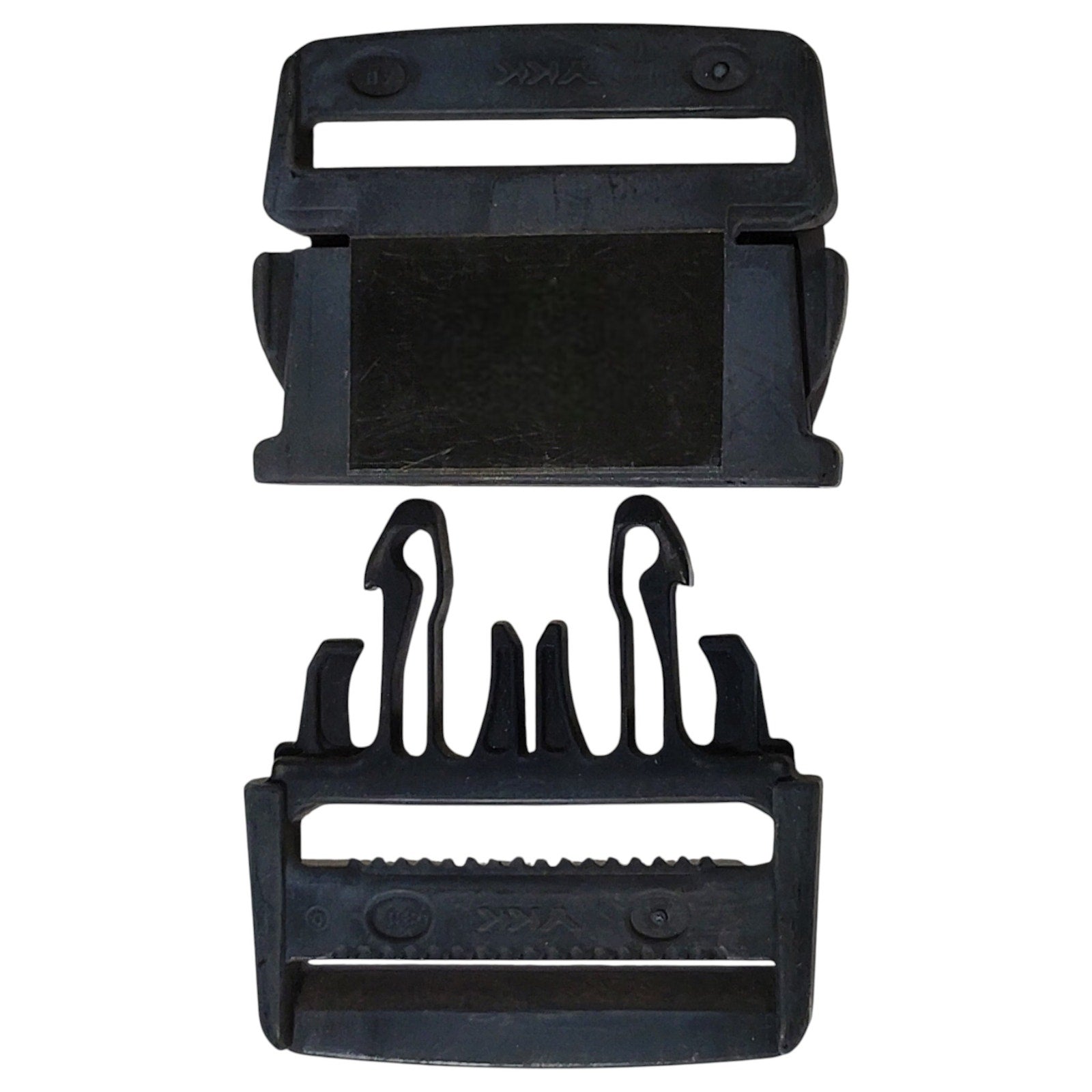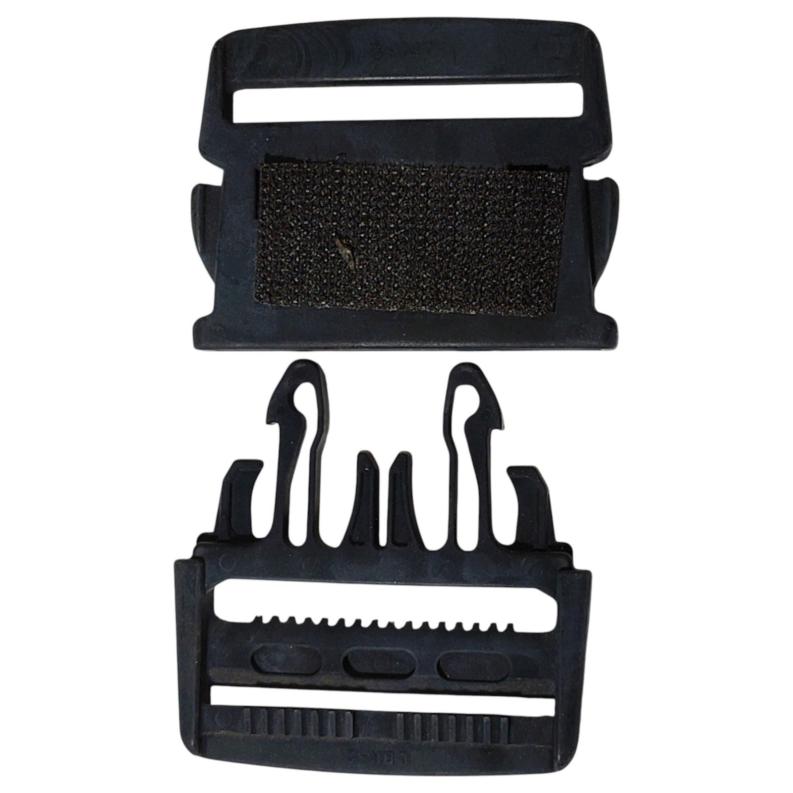 Heavy-duty two-part adjustable side-release buckle designed for use with 2-inch wide straps or webbing. Made from durable black polymer, this buckle features a quick-release mechanism for fast deployment and secure fastening. The rear side includes integrated hook-n-loop backing, making it fully Velcro-compatible for modular attachment to loop surfaces on tactical gear, packs, or field equipment. Ideal for repairs, upgrades, or custom gear builds. Sold as a single unit.