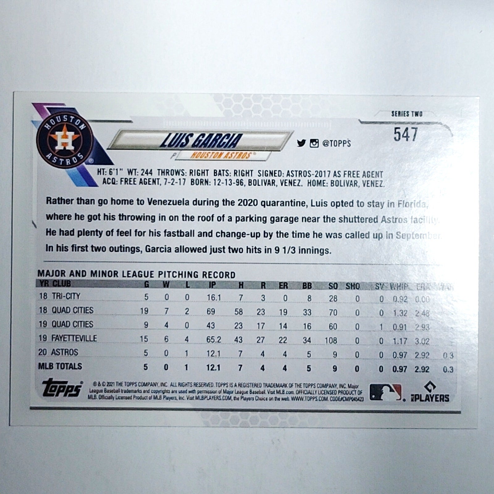 2021 Topps Series 2 Luis Garcia 547 RC Houston Astros Pitcher Rookie VG/EX