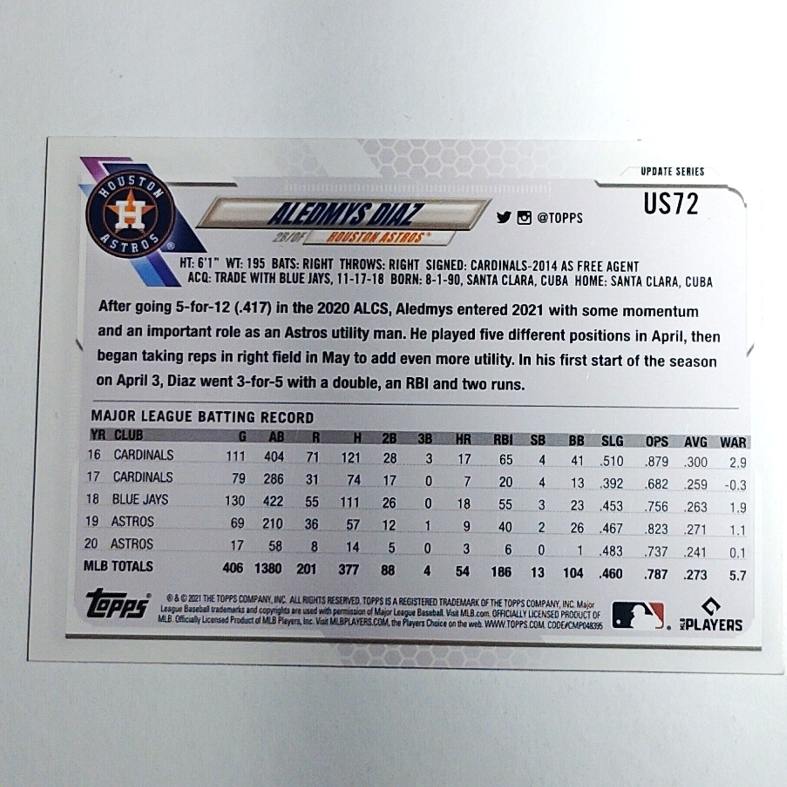2021 Topps Update Aledmys Diaz Houston Astros 2B/OF Card #US72 VG/EX