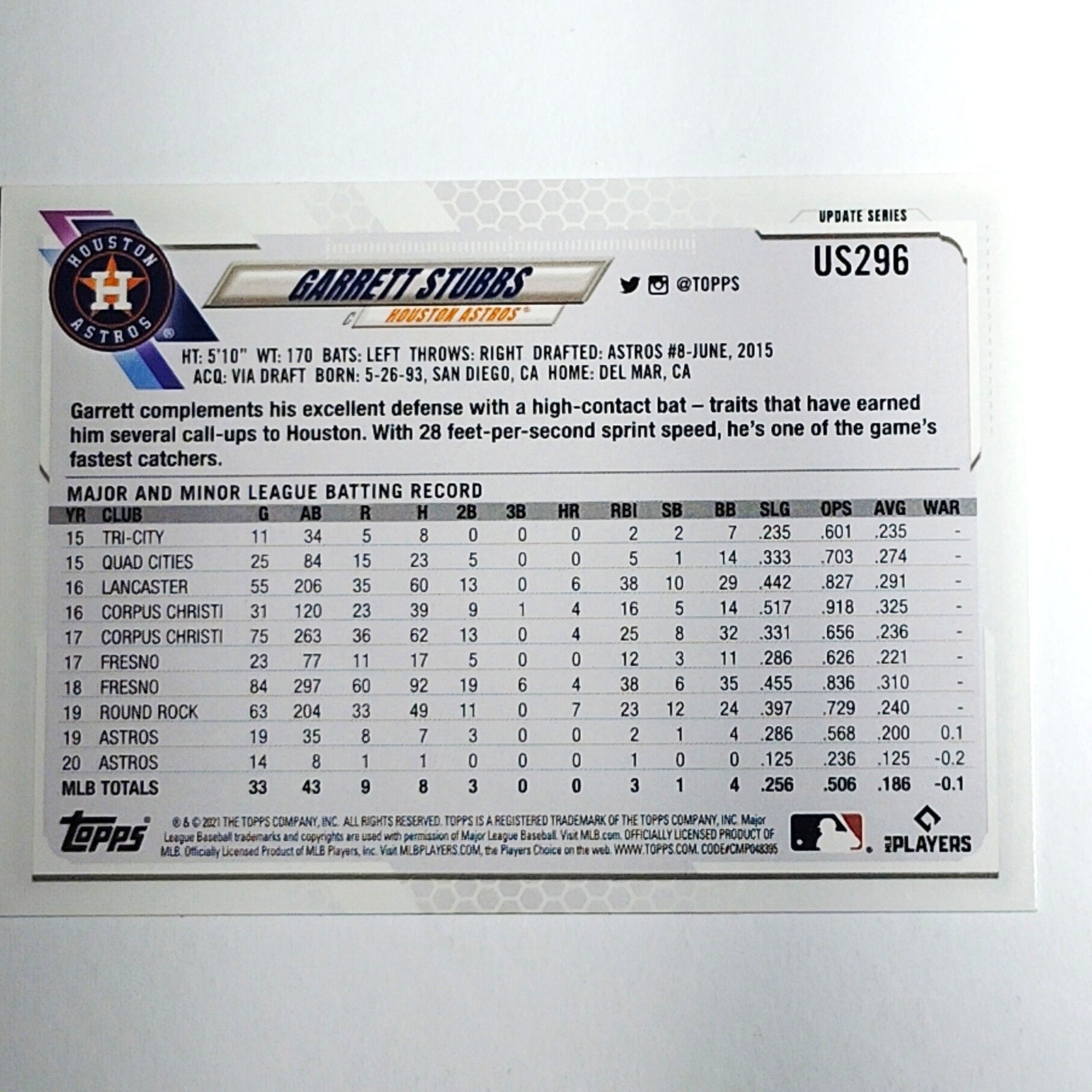 2021 Topps Update Series Garrett Stubbs card #US296 featuring the Houston Astros catcher during his role as a versatile depth piece behind the plate. Stubbs was known for his athleticism, defensive flexibility, and ability to contribute in spot starts throughout Houston’s season. Card is ungraded and in Very Good to Excellent condition with light handling wear typical for modern Topps stock.