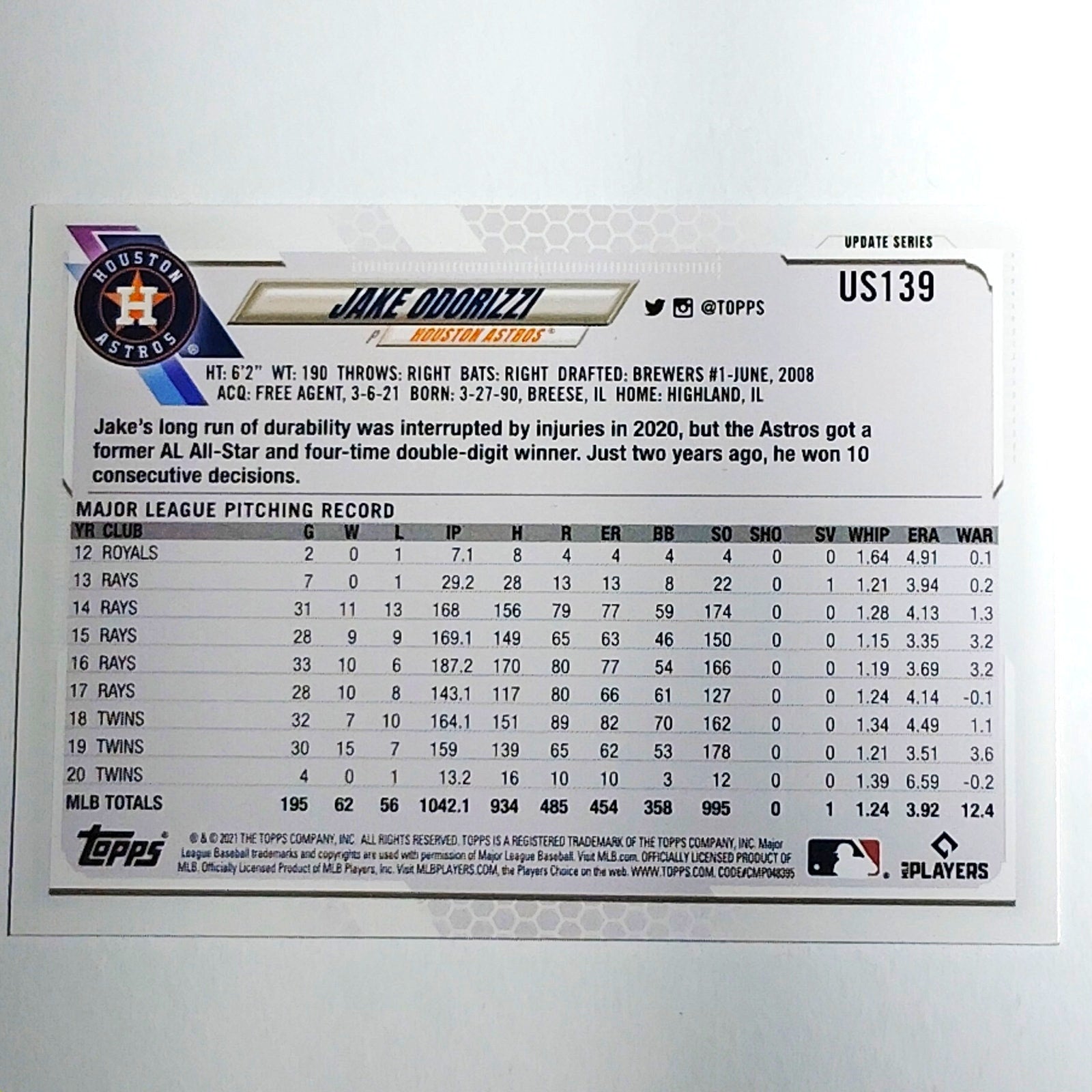 2021 Topps Update Series Jake Odorizzi card #US139 featuring the Houston Astros pitcher during his tenure as a steady veteran arm in Houston’s rotation. Odorizzi was known for his effective fastball‑splitter mix, ability to generate weak contact, and value as a reliable innings‑eater. Card is ungraded and in Very Good to Excellent condition with light handling wear typical for modern Topps stock.