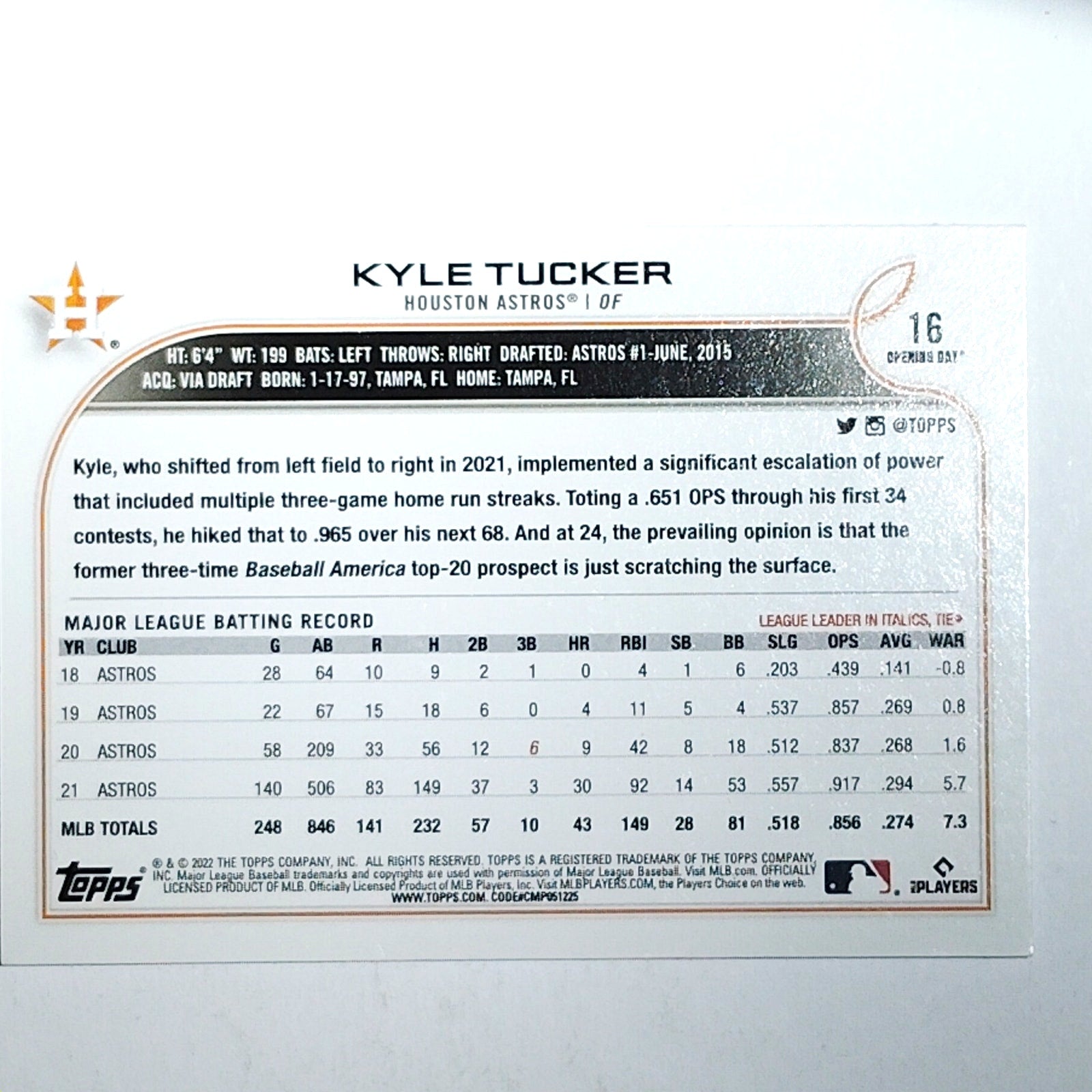 2022 Topps Opening Day #16 Kyle Tucker Houston Astros Outfielder - VG/EX