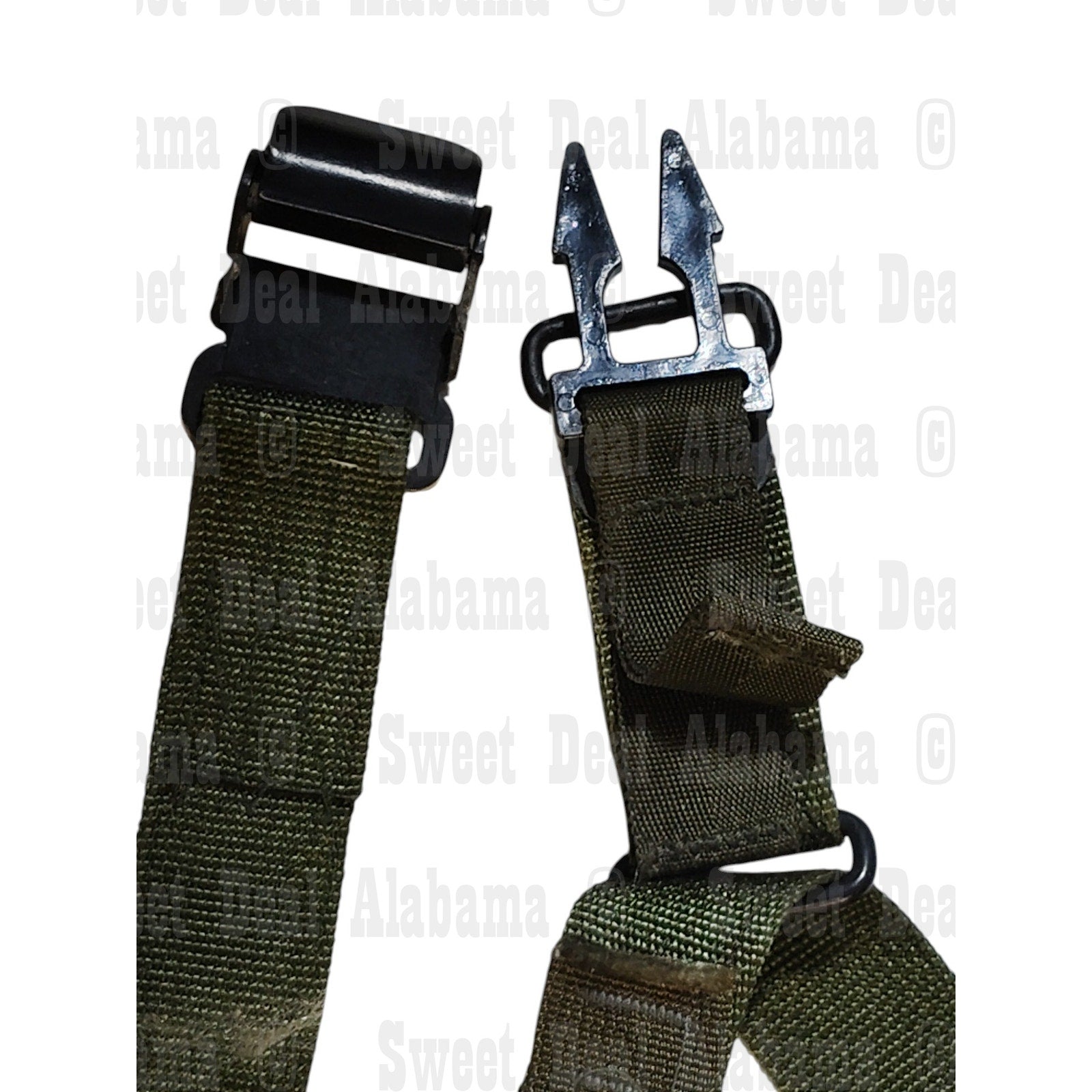 This versatile olive drab webbing strap features multiple fasteners for adaptable field use—ideal for securing gear, packs, or modular equipment in military or outdoor settings: