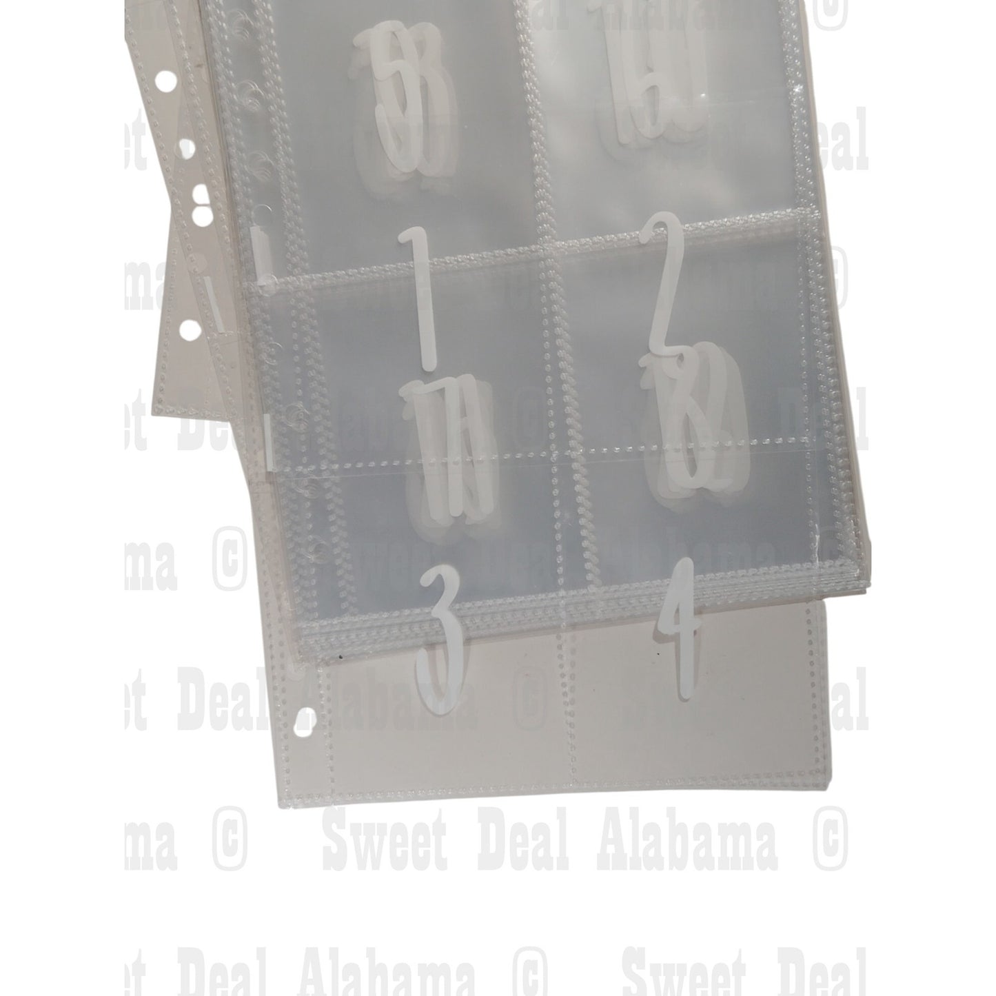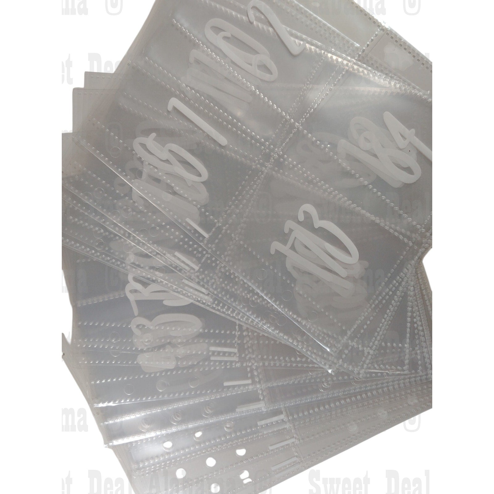 The 25-Piece 4-Pocket Protector Set is designed for 6-ring A5 binders, offering organized storage with pre-printed numbers from 1 to 100. Each clear plastic sleeve features four pockets, making it ideal for sorting and tracking items.