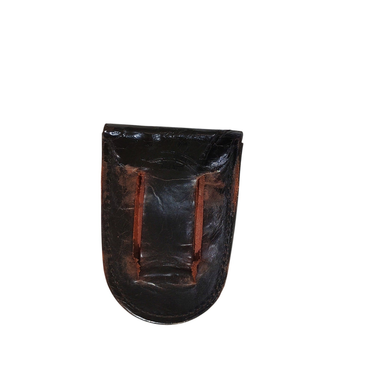 Vintage leather MP handcuff holster case as belt attachment. Measures approximately 5-1/2″ × 3-7/8″ when closed and 8-1/2″ long when fully opened. No manufacturer stamps or markings present. Features non-working snap closure and reinforced stitching. Designed for standard chain or hinge-style handcuffs. Ideal for collectors, reenactors, or law enforcement display. Pre-owned in excellent functional condition.
