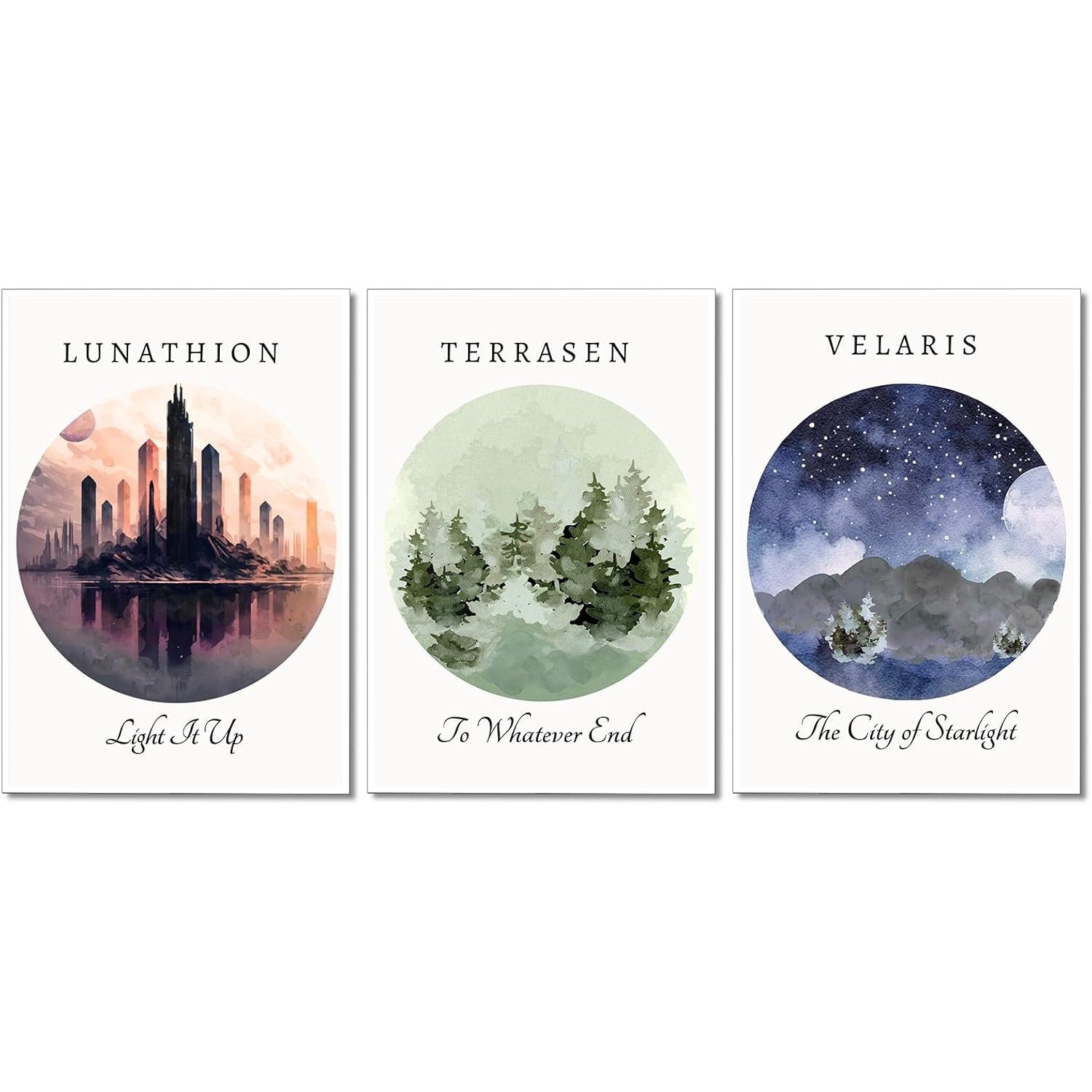 This 3-piece unframed canvas print set showcases artwork inspired by Sarah J. Maas’s most beloved fantasy series: A Court of Thorns and Roses, Crescent City, and Throne of Glass. Each piece measures 12x16 inches and is printed on high-quality canvas with vibrant detail. Perfect for decorating a bedroom, library, or reading nook, these prints bring the magic of fantasy literature to your walls.