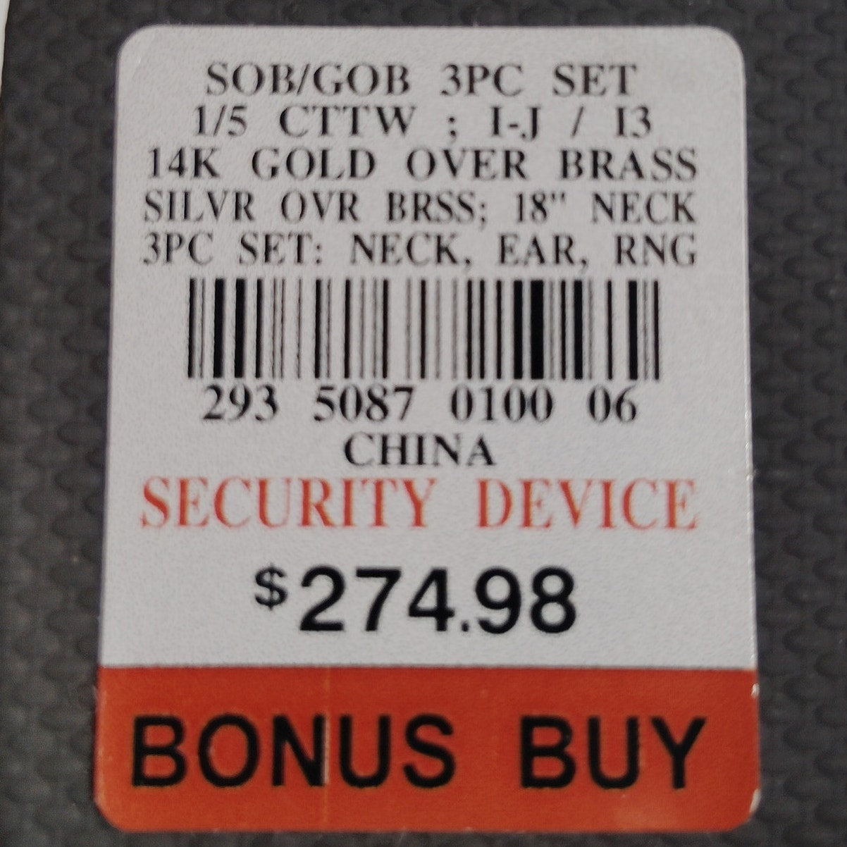 Elegant 3-piece jewelry set featuring a necklace, earrings, and ring, crafted with 14K gold over brass and silver-tone accents. Each piece showcases a segmented design encrusted with 1/5 carat total weight (CTW) of sparkling stones rated I-J color / I3 clarity, offering a brilliant look at an accessible price point. The necklace measures 18 inches and features a graceful V-shaped centerpiece. Packaged in a textured black gift box with silver ribbon, this set is ideal for formal occasions, gifting, or everyday elegance.