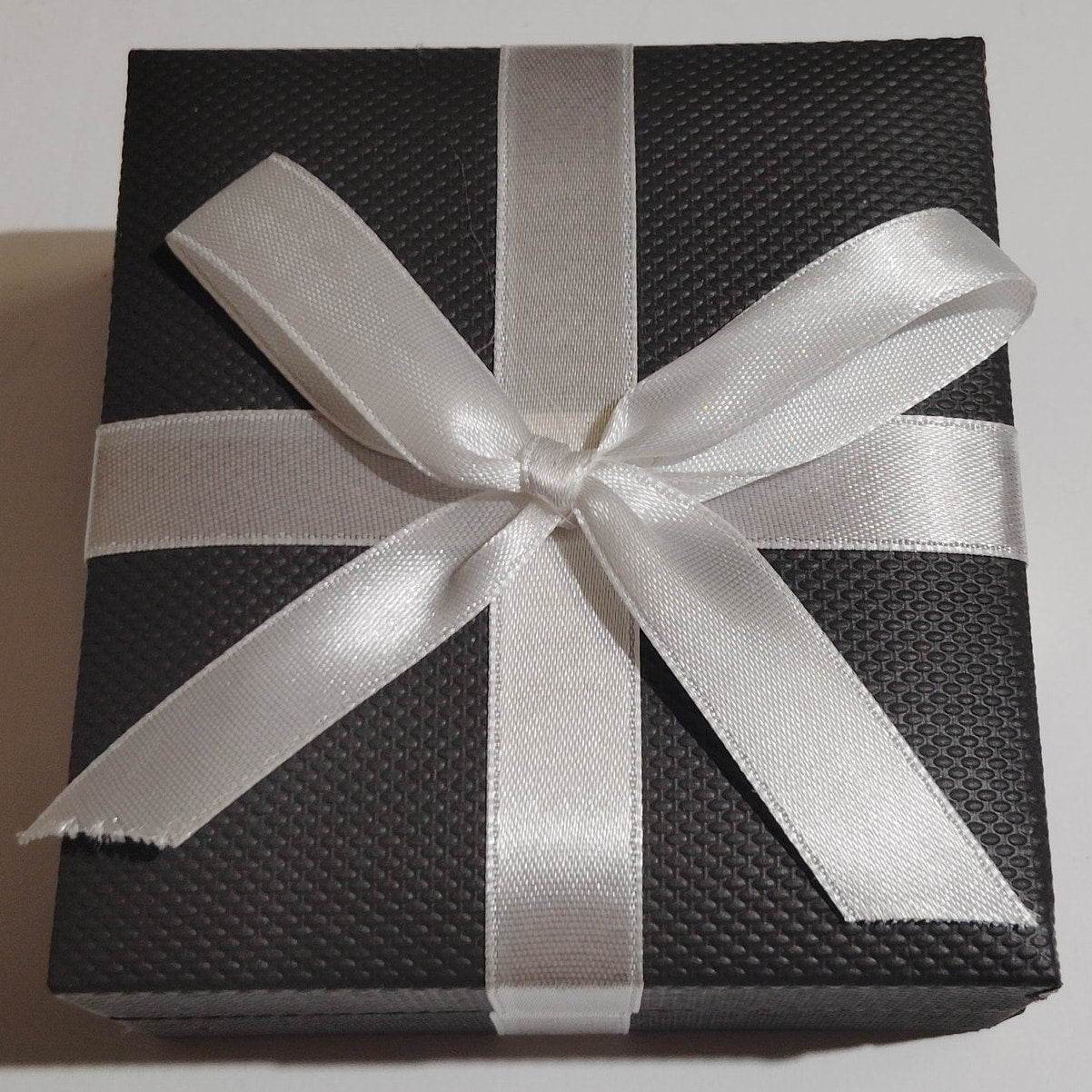 - Packaging: Textured black gift box with silver ribbon