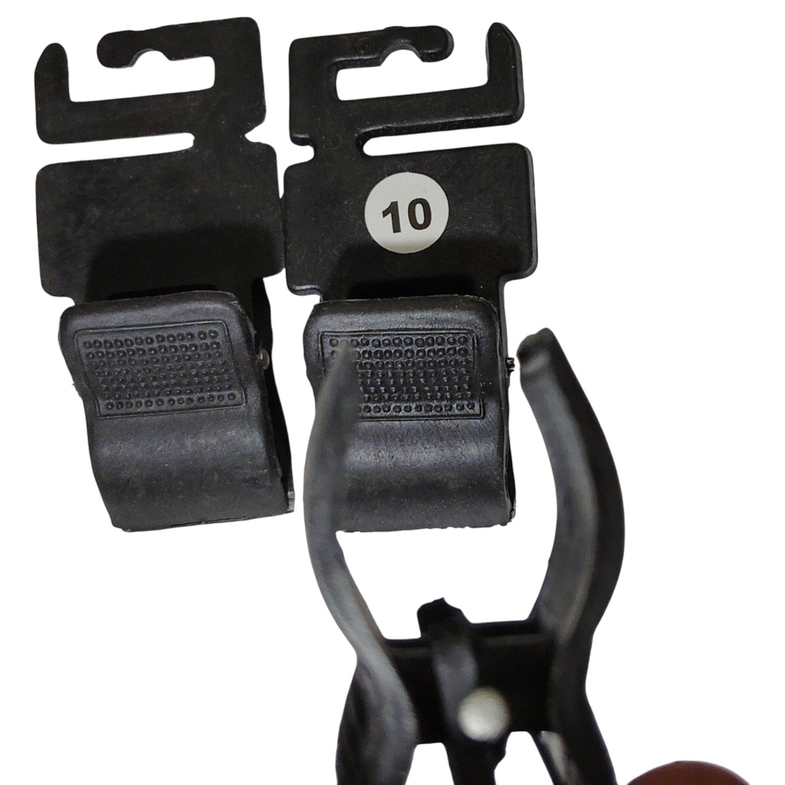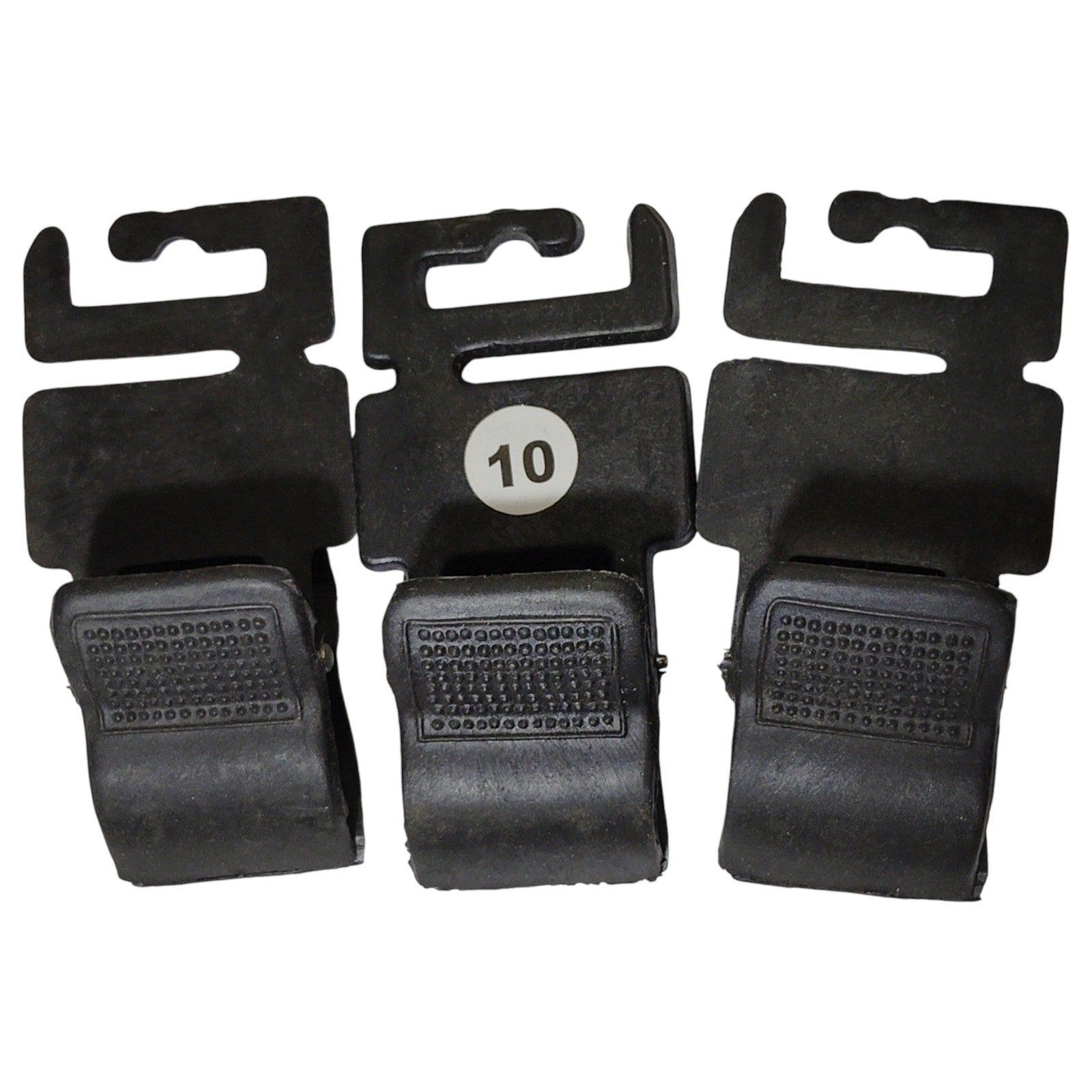 Set of three heavy-duty black plastic adapter clips designed for secure attachment to pegboard hooks. Each clip features a robust spring-loaded grip ideal for suspending lightweight tools, accessories, or packaged goods directly from pegboard systems. Outer dimensions measure 1¾" wide by 3.75" high, with a molded rear channel that seats cleanly onto standard pegboard hooks. Durable construction suitable for retail displays, workshop organization, or surplus gear setups. Sold as a lot of 3 units.