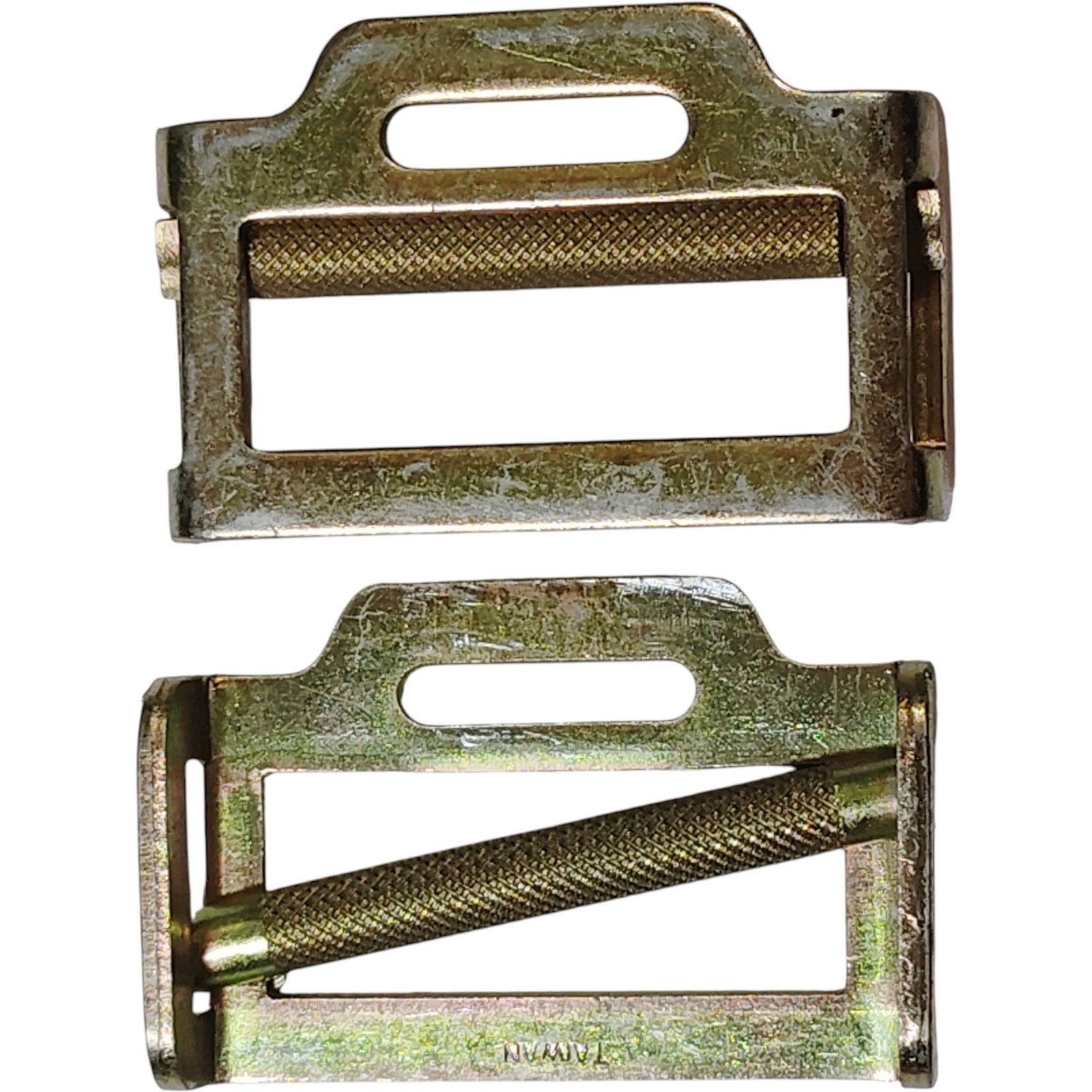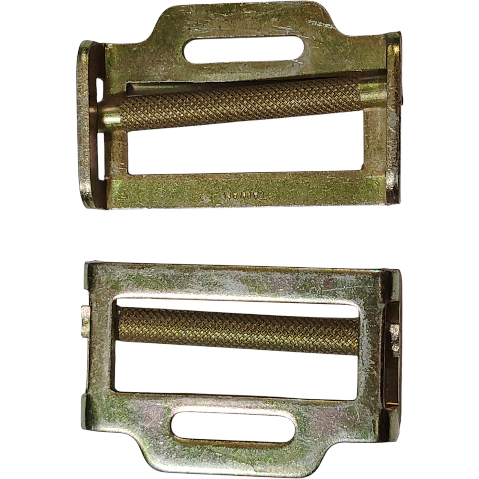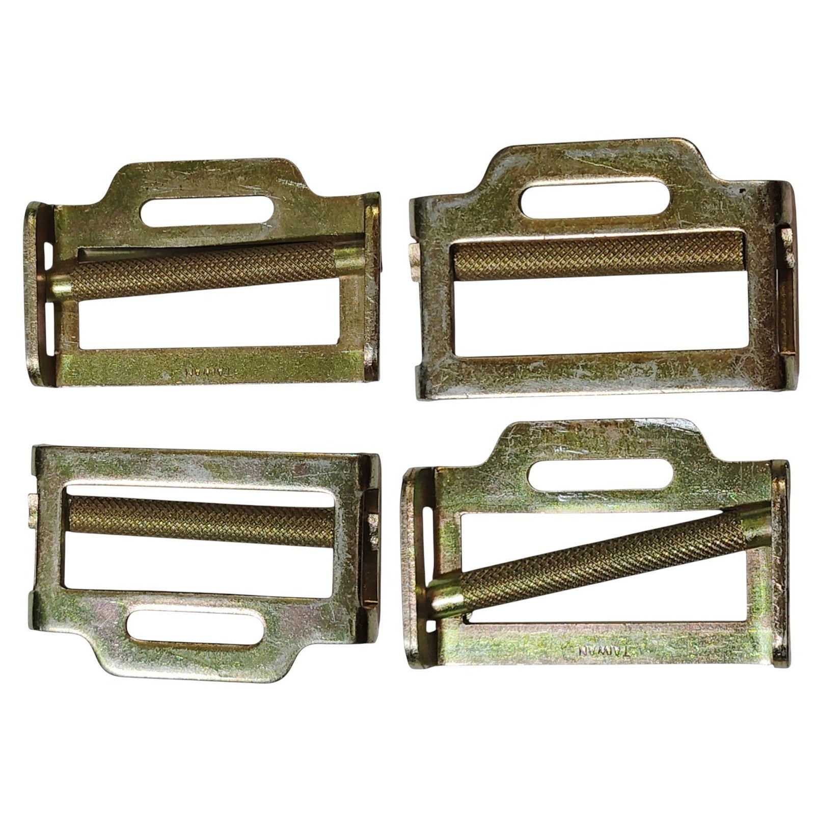 4 heavy-duty adjuster cinch brackets, precision-engineered to accommodate 1.75″ webbing. Drop-forged, stamped alloy steel buckles feature a cinching center pin for secure tensioning and a 1″ front slot designed for sewing on lifting tabs—ideal for quick adjustments or tension relief in field applications. Each is thermally treated and 100% proof load tested to 2,000 lbs, meeting or exceeding PIA-H-7195 specifications for aerospace-grade hardware. Suitable for tactical gear, parachute rigging, industrial safety harnesses, or custom strap systems.