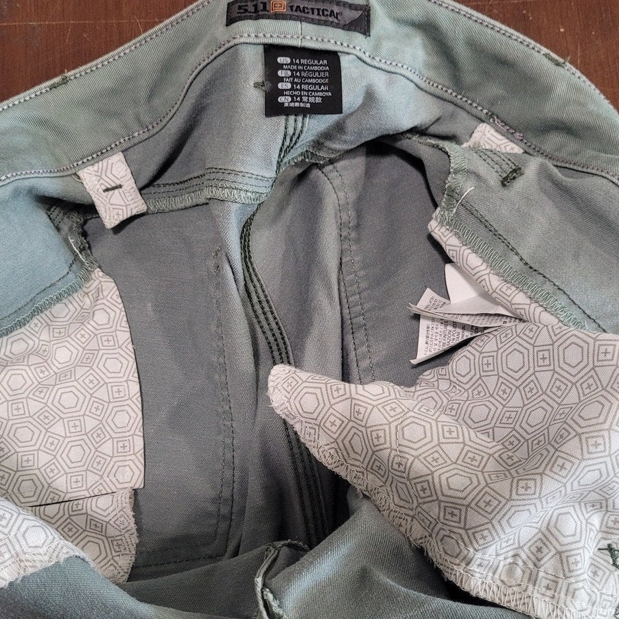 This listing is for a pair of 5.11 Tactical pants, size 14 Regular, in green, made from a 66% cotton / 31% polyester / 3% elastane blend. These pants offer a balance of durability, flexibility, and comfort—ideal for tactical use, range days, or everyday wear.