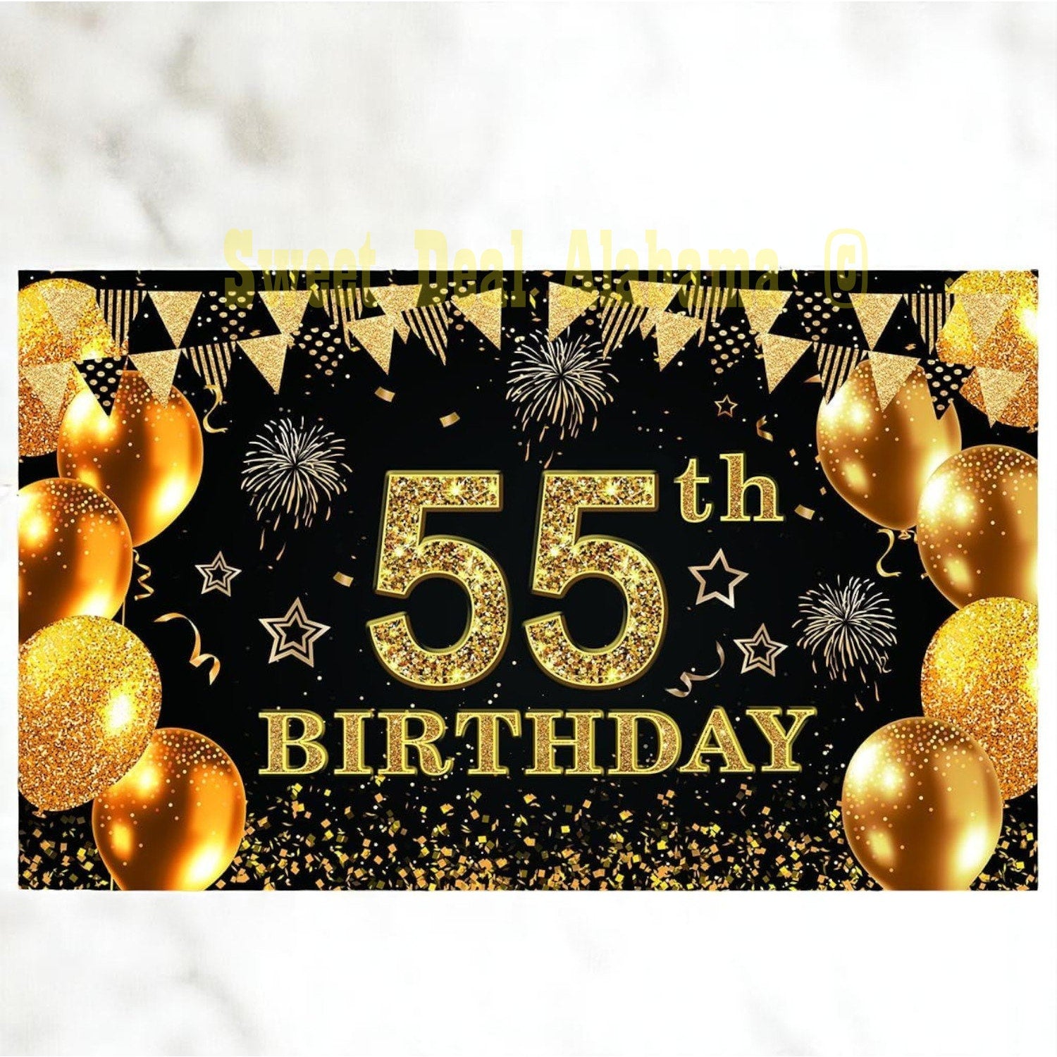 The Extra Large Fabric Black Gold Sign Poster is a stylish and eye-catching backdrop designed for 55th birthday celebrations.