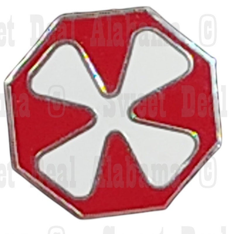 The 8th Army DUI Collectors Pin features a distinctive octagonal shape with a red background and a white cross-like emblem at its center. Measuring 3/4 inches in diameter, this pin represents the 8th United States Army, a historically significant unit known for its operations in the Pacific and Korean War.