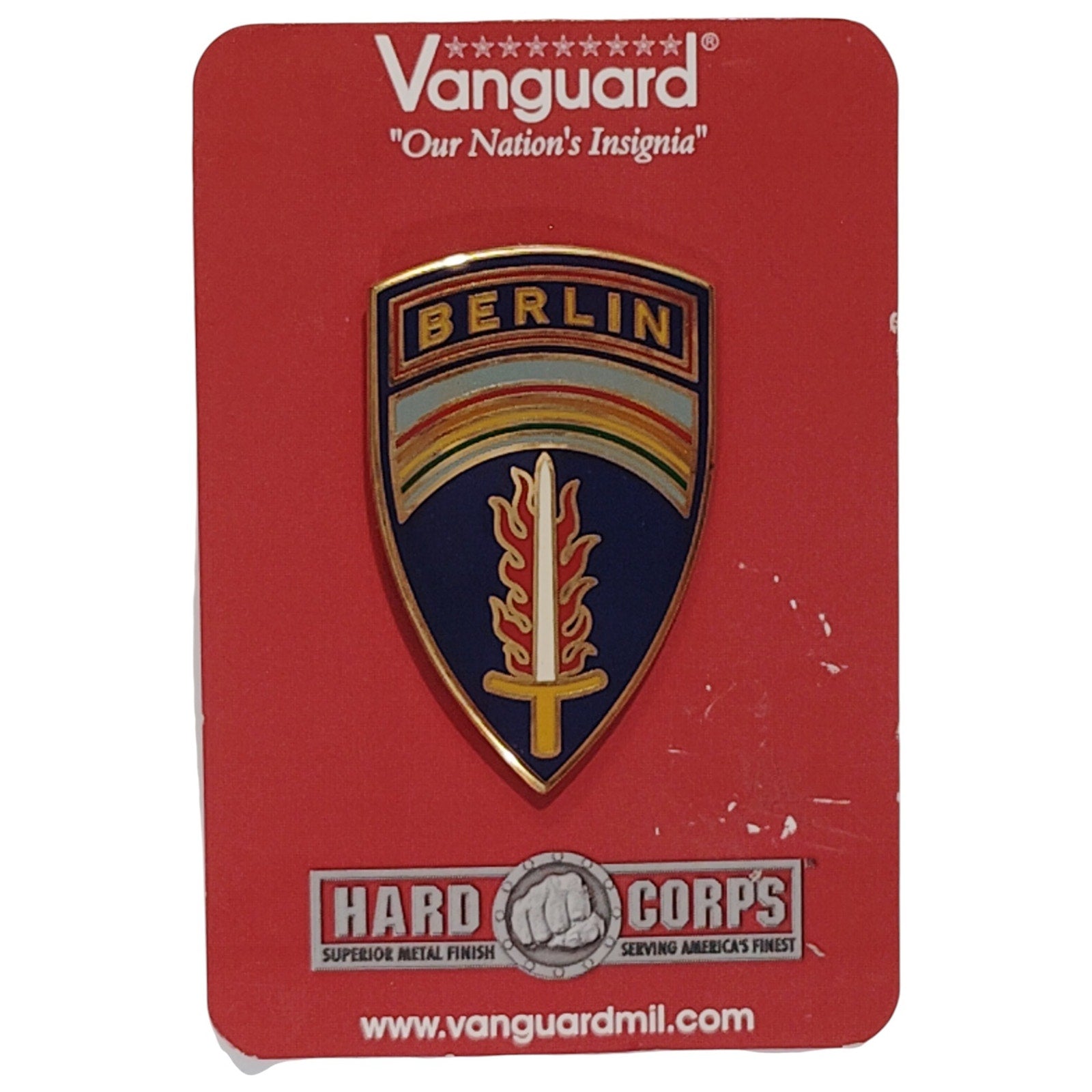 Official U.S. Army Combat Service Identification Badge (CSIB) for the historic U.S. Army Berlin Command. Displays the unit’s insignia in full-color enamel on a silver-tone metal base. Measures 1-1/2 inches wide by 2 inches high. Authorized for wear on the new blue Army Service Uniform (ASU), Class A, and Class B uniforms. Manufactured by Vanguard Industries to meet military specifications. Individually packaged. Made in the USA.
