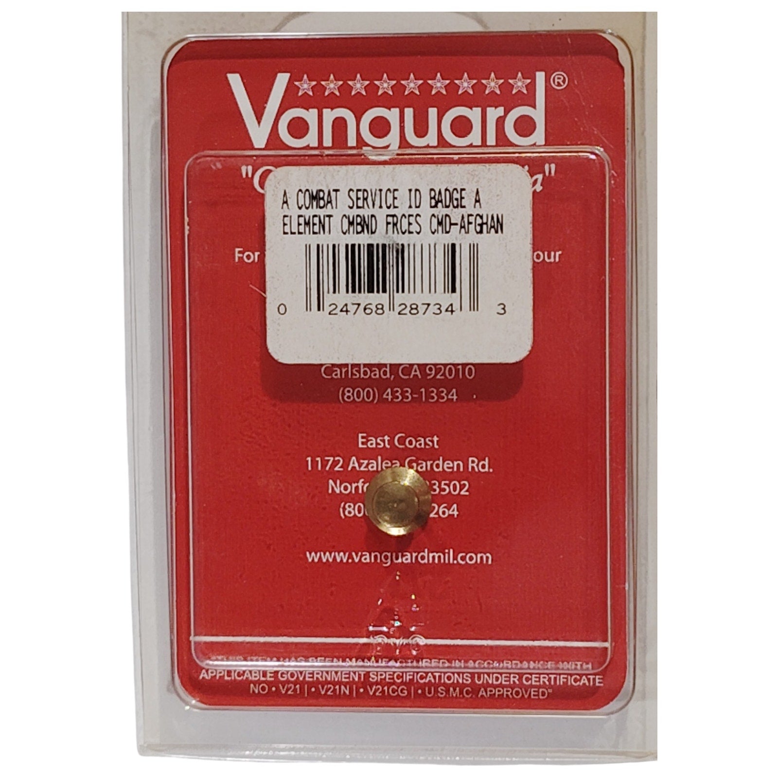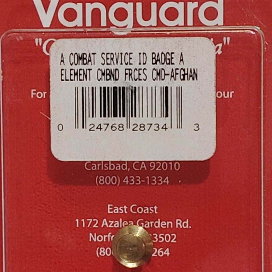 Official Combat Service Identification Badge (CSIB) for the U.S. Army Element Combined Forces Command – Afghanistan, manufactured by Vanguard Industries. Sized at 1½" x 2", this badge is authorized for wear on the New Blue Army Service Uniform (ASU), including Class A and Class B configurations. It signifies deployment and service in support of Combined Forces operations in Afghanistan. Crafted in polished metal with regulation-grade detailing. In New, Unused Condition, carded for presentation or issue.