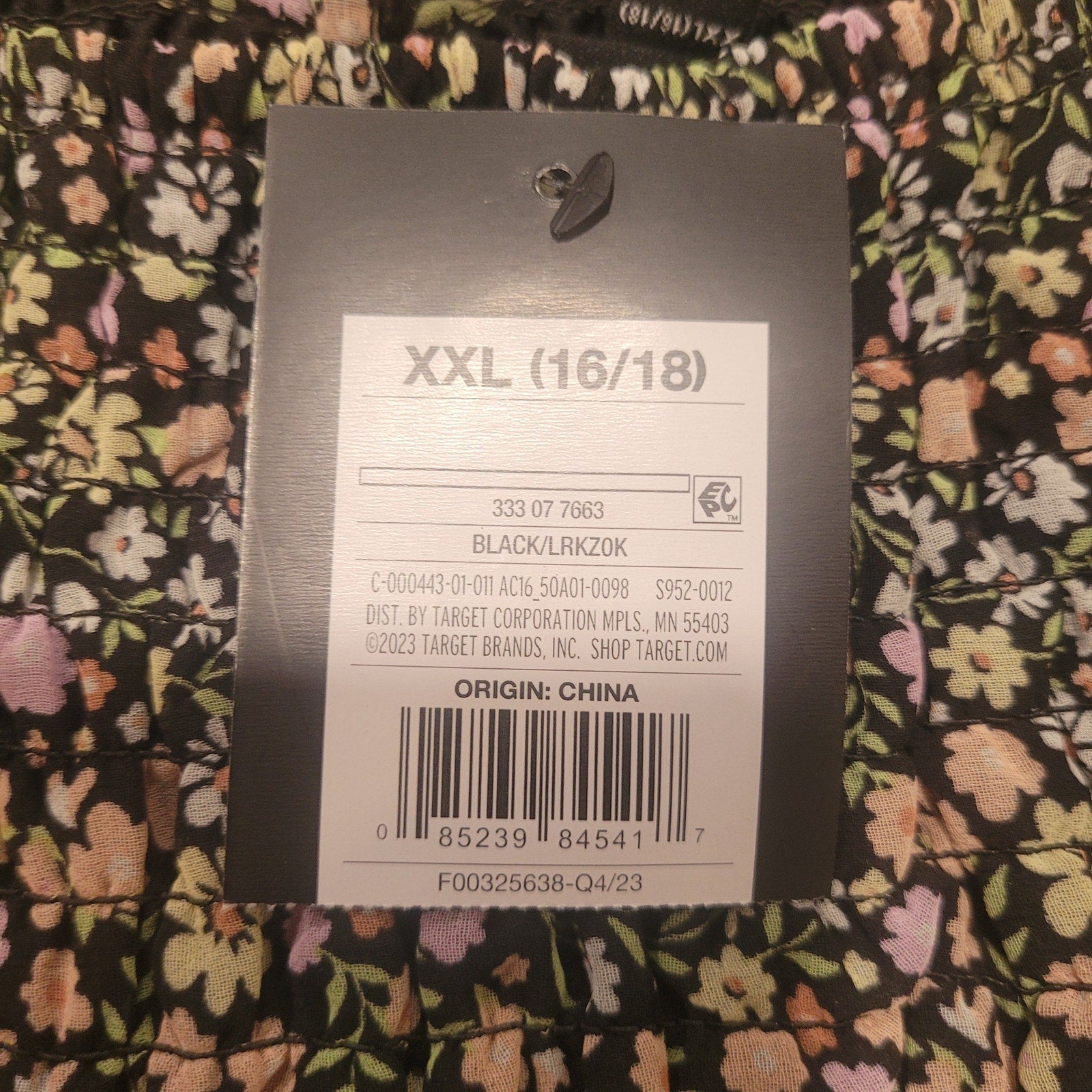 This Art Class™ girls' chiffon dress features a black base with an allover pink and green floral print. Designed with short puff sleeves, a smocked bodice, and subtle side cut‑outs for a modern silhouette. The tiered skirt adds movement and charm, while the XXL size offers a comfortable fit for teens. Lightweight and flowy, perfect for spring events, casual outings, or dressy occasions. New and unused. UPC 085239845417.