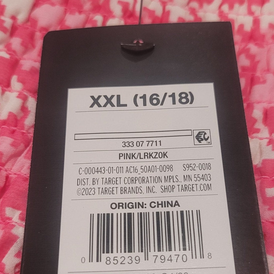 This Art Class™ girls' dress features a pink and white houndstooth pattern with a smocked bodice, short puff sleeves, and a tiered A‑line skirt. Some units include a subtle cutout detail at the waist for added style. Made from lightweight woven fabric, this XXL (16/18) size offers a comfortable fit for teens. Ideal for spring outings, school events, or casual dress‑up occasions. New and unused. UPC 085239794708.