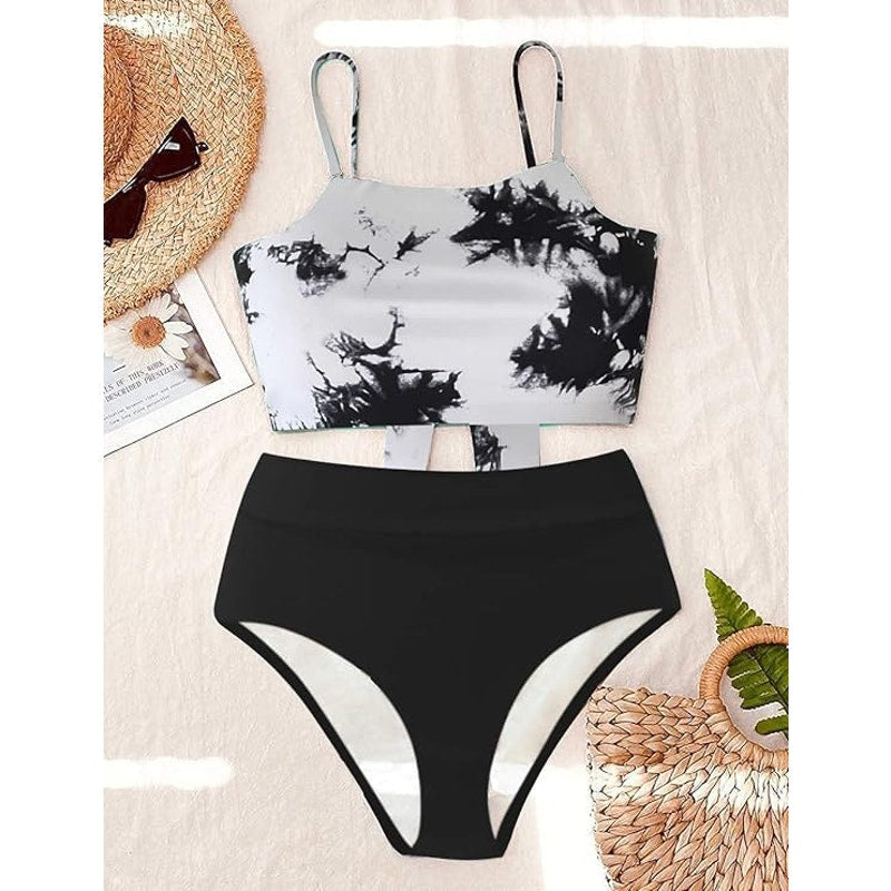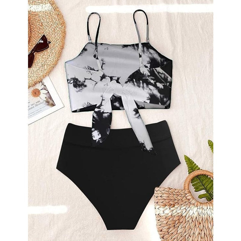 Avanova High Waisted, Tie Dye Tie Back Swimsuit Bikini Set Tie Dye Black, XS