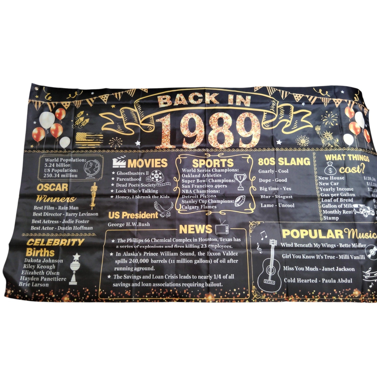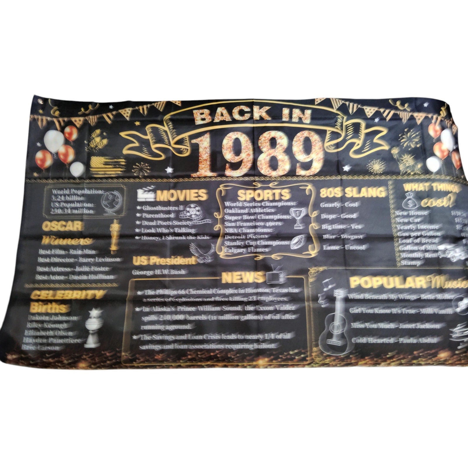Celebrate a milestone with this nostalgic "Back in 1989" banner, perfect for birthdays, reunions, or themed parties. Measuring a generous 6x3.6 feet, this backdrop features fun facts and trivia from the year 1989, including Oscar winners, celebrity births, music, movies, sports highlights, and iconic 80s slang. Designed with festive balloons and confetti graphics, it sets the tone for memorable photos and conversations. Suitable for men and women alike, this banner adds a personal touch to any celebration.