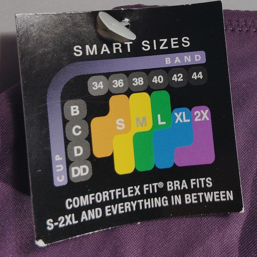 Bali Comfort Revolution Line Lace Wireless Bralette (Style DF6594), size Small, in Blackberry Jam (Deep Purple). This wireless bralette features smooth, seamless cups with thin adjustable straps and a wide lace bottom band for added support and feminine detail. The lace band blends floral and geometric patterns with a sheer accent strip for visual contrast. Designed for light support and everyday comfort, this style fits cup sizes 34D, 34DD, 36B, and 36C with flexible stretch and a flattering silhouette