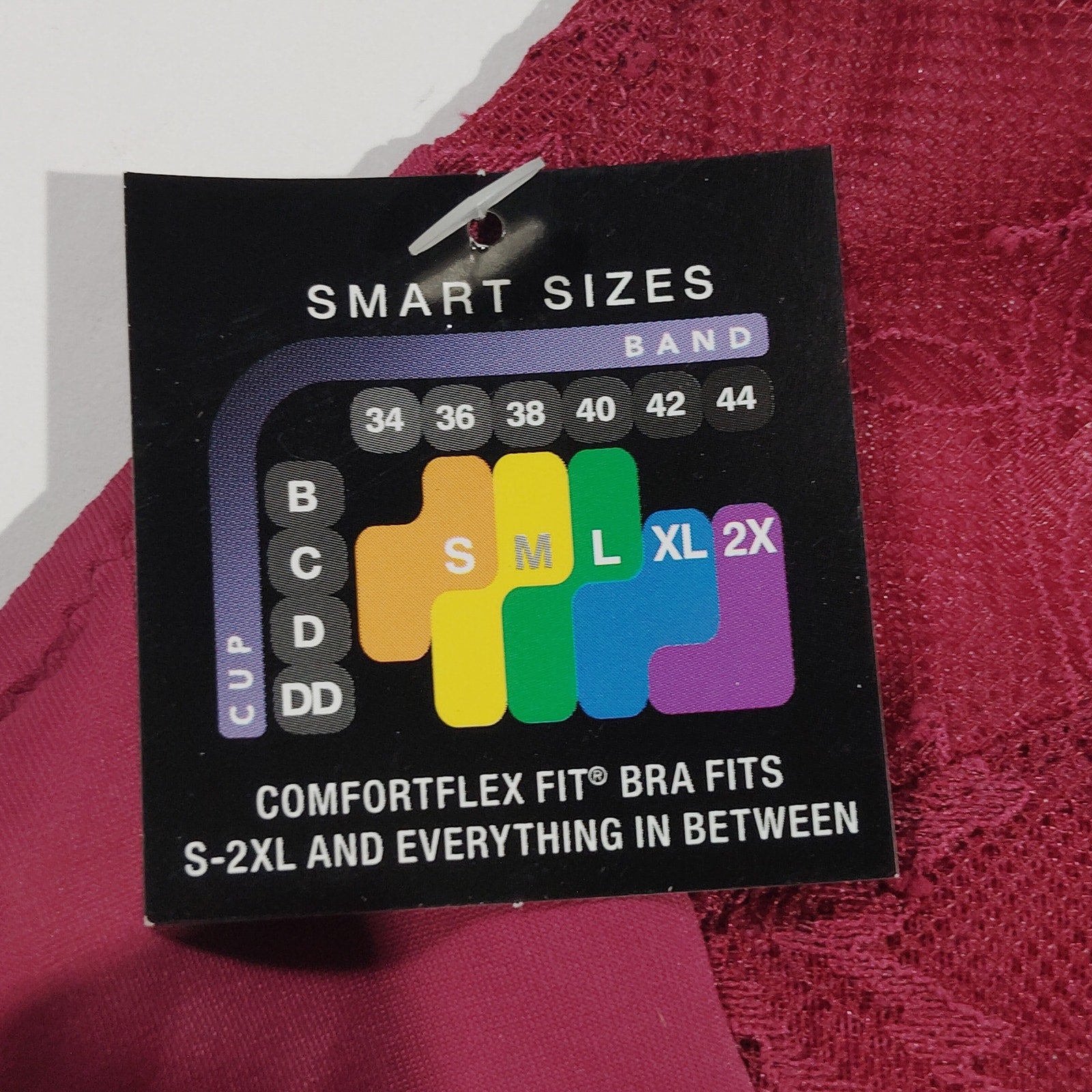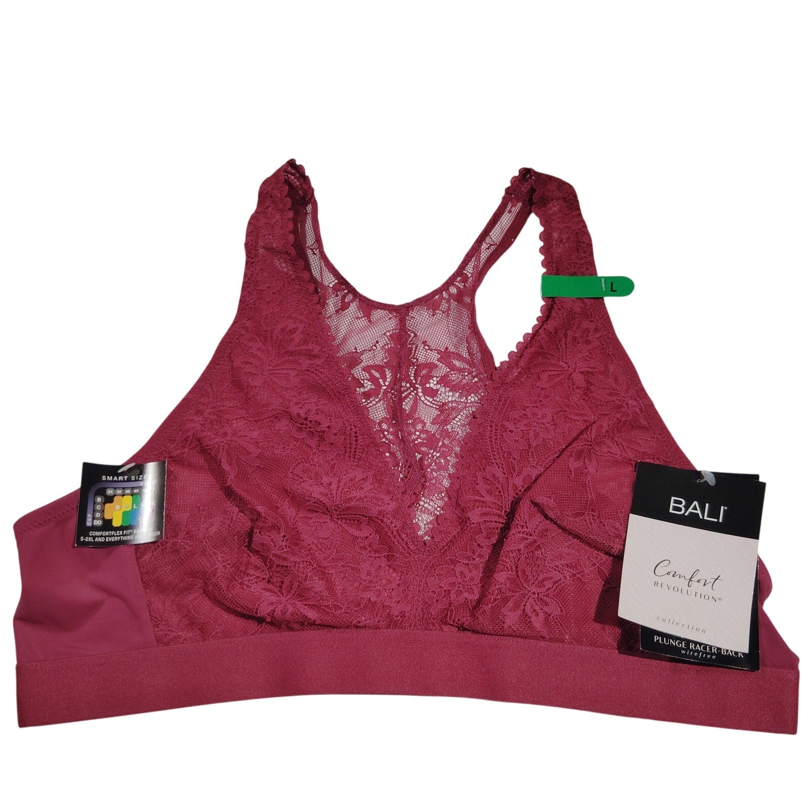 Bali Comfort Revolutionize Wireless Plunge Bralette (Style DF6593), size Large, in Deep Cerise. This wireless bralette features a plunging neckline with scalloped floral lace, molded cups for light shaping, and a smooth stretch underband for gentle support. Designed for comfort and elegance, it offers a sleek silhouette under clothing with breathable fabric and a tag-free finish. Fits cup sizes 38D, 38DD, 40B, and 40C.