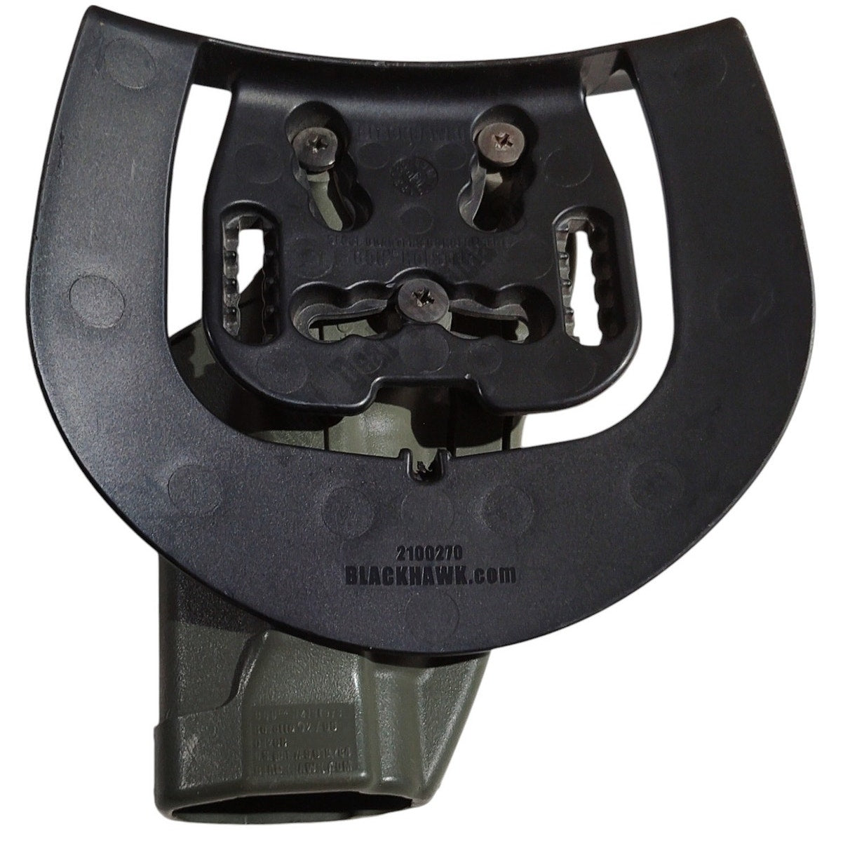 The Blackhawk 2100270 holster is part of the SERPA Close Quarters Concealment (CQC) series, designed for outside-the-waistband carry. It features the patented SERPA Auto-Lock™ system, which secures the firearm and allows for a smooth, natural draw. The holster includes a "speed cut" design for rapid target acquisition and re-holstering, making it suitable for tactical and everyday use. It also comes with both a belt loop and paddle platform, offering adjustable cant for user preference.