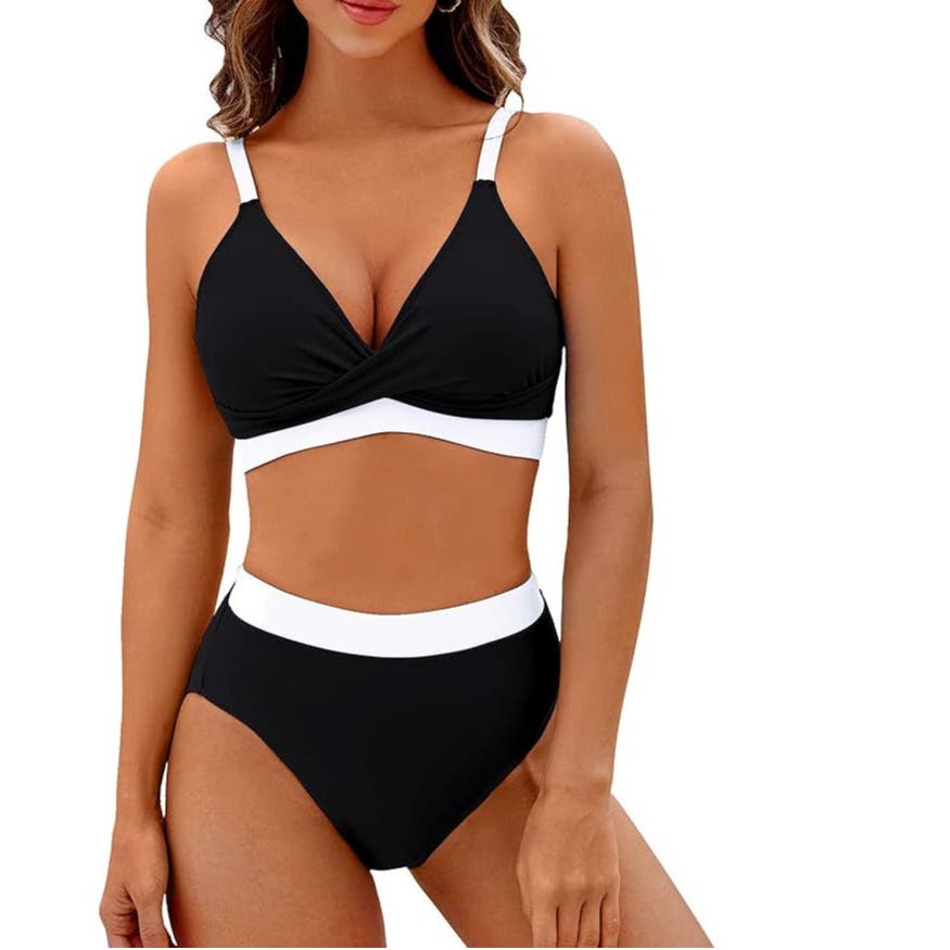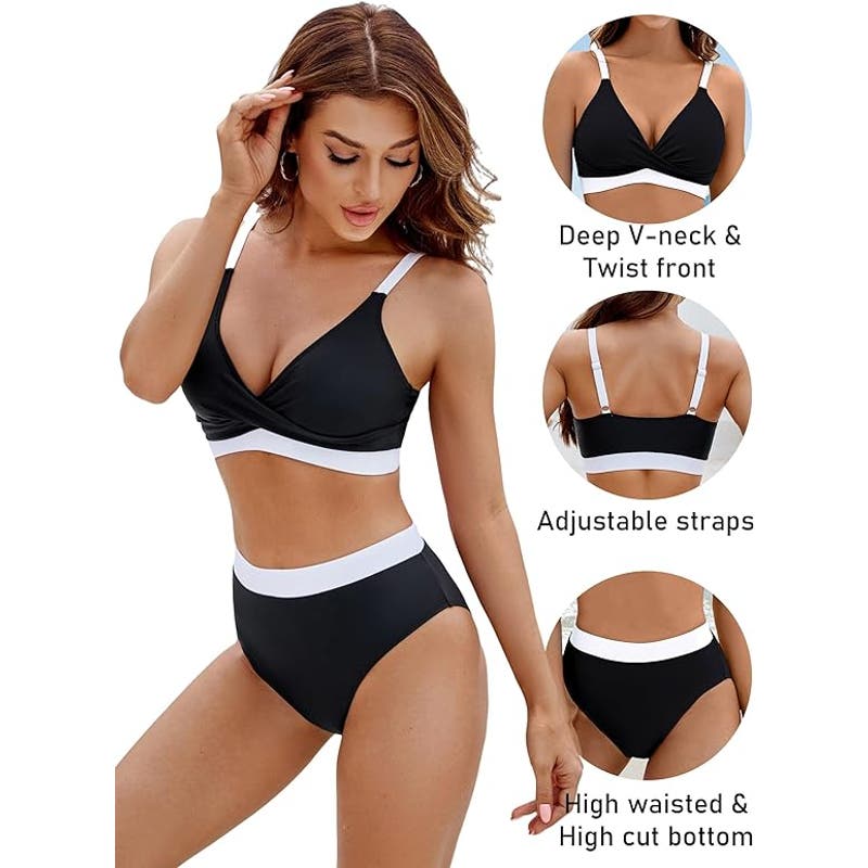 BMJL High Waisted V Neck 2-Piece Color Block Twist Front Bathing Suit, M, Black