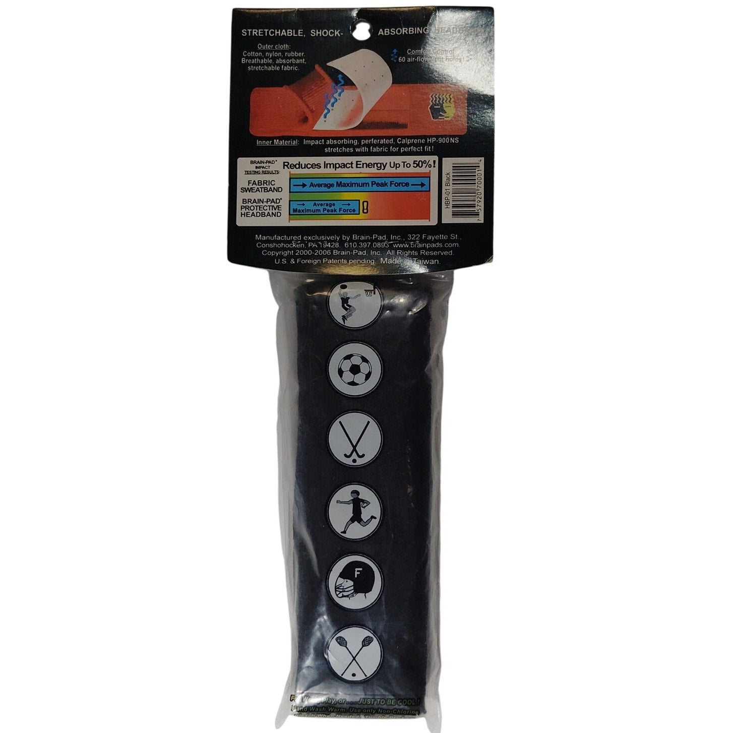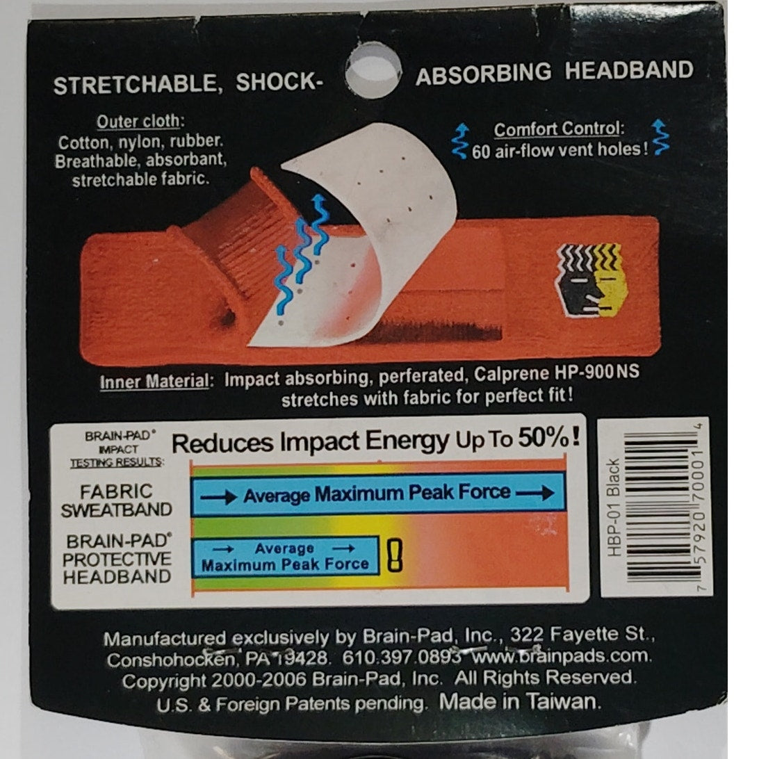 Performance sweatband by Brain Pad designed for football, soccer, and rugby athletes. Unisex adult fit with moisture-wicking fabric and secure stretch design for high-impact sports. Black color. UPC 757920700014. Ideal for training, competition, and contact sports requiring durable headwear.
