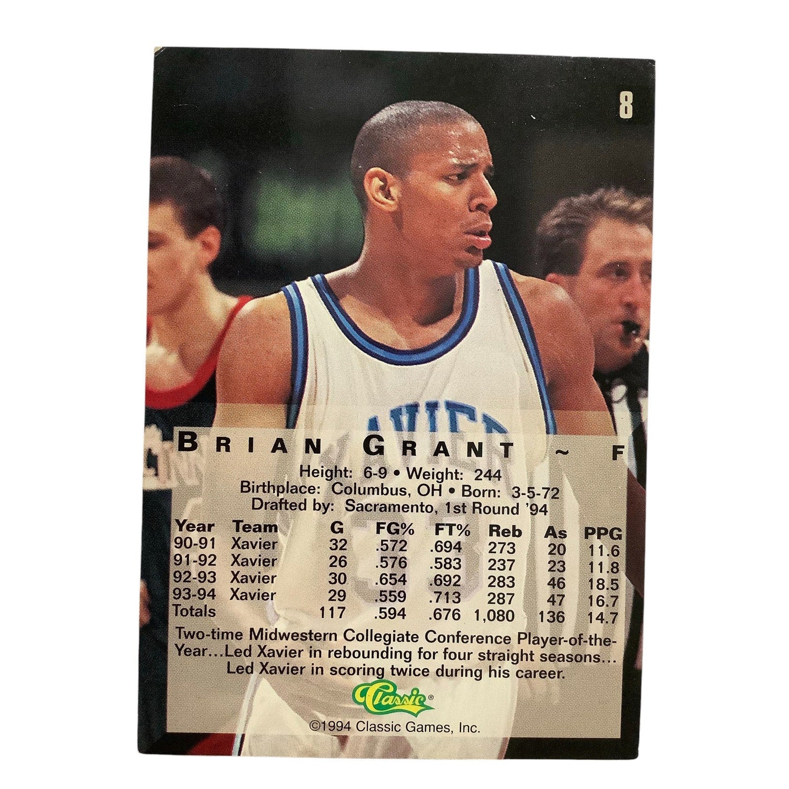 Brian Grant, Univ. Xavier (F), Classics 1994, 4Sport Card 8, EXC