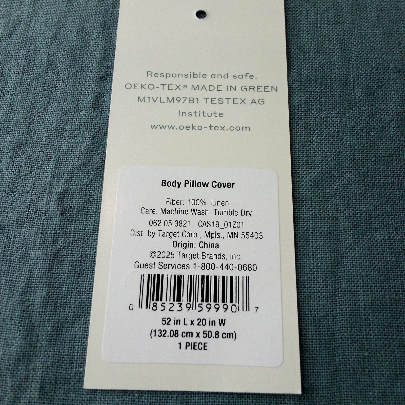Casaluna™ Linen Body Pillow Cover in light teal, made from 100% linen for a breathable, textured feel. Features a woven finish with a hidden zipper closure for a secure fit and easy removal. OEKO‑TEX certified for safety and comfort. Designed to complement modern, neutral, or spa‑inspired bedding. Item is NEW.