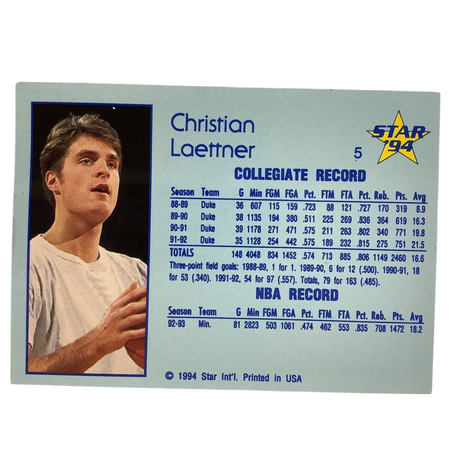 Christian Laettner, Duke and Minn., 1994 Star Int'l College and NBA Card 5, EXC
