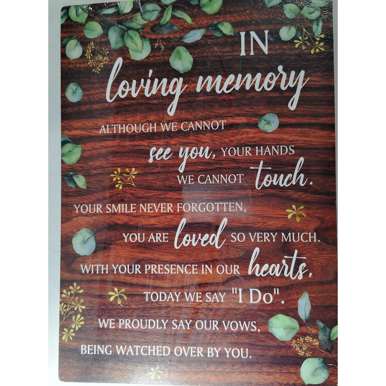 Elegant acrylic memorial sign designed to honor loved ones during weddings and special ceremonies. This 8.3" x 11" unframed tabletop plaque features a clear acrylic panel printed with heartfelt text and a greenery motif, paired with a matching wooden base for stable display. A subtle and meaningful way to express remembrance and love, this sign complements rustic, boho, and classic wedding themes. Ideal for use at receptions, anniversaries, or family gatherings.