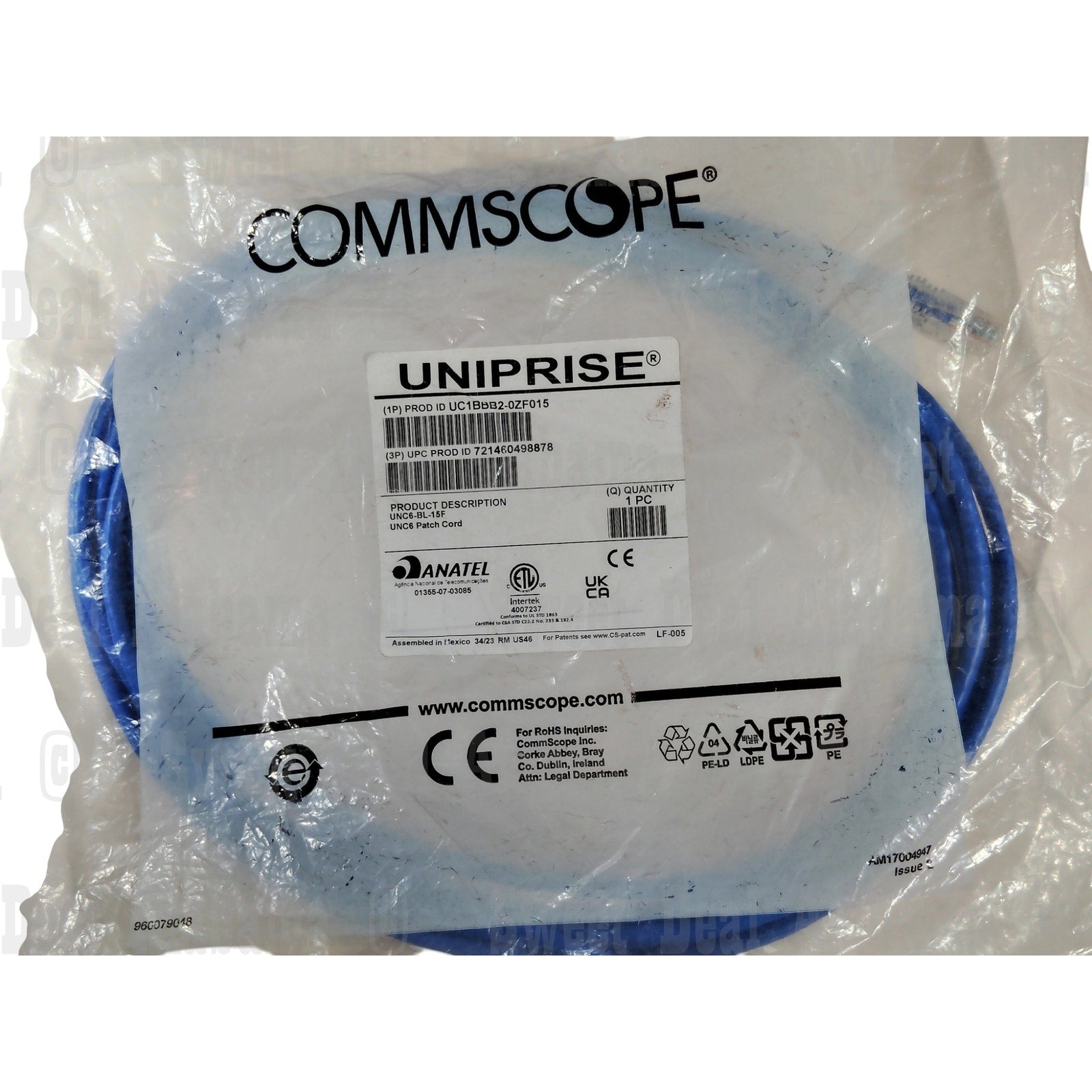 The CommScope Uniprise CAT6 Patch Cable (UNC6-BL-15) is a high-performance Ethernet cable, designed for fast and reliable network connections. Measuring 15 feet, it features a clear stress-relief boot for durability and RJ45 connectors for seamless compatibility.