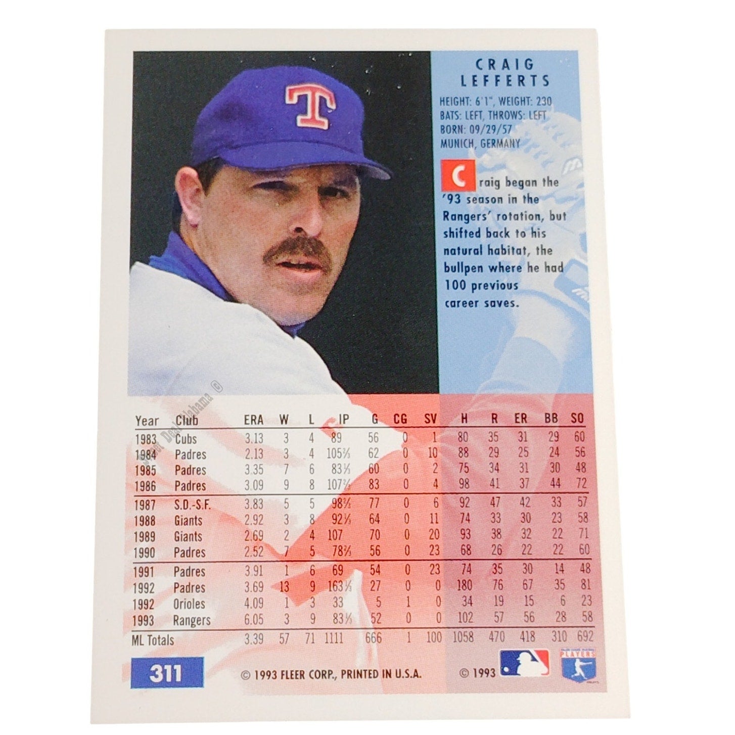 Craig Lefferts, Texas Rangers, #311, 1994 Fleer Baseball Collector's Card