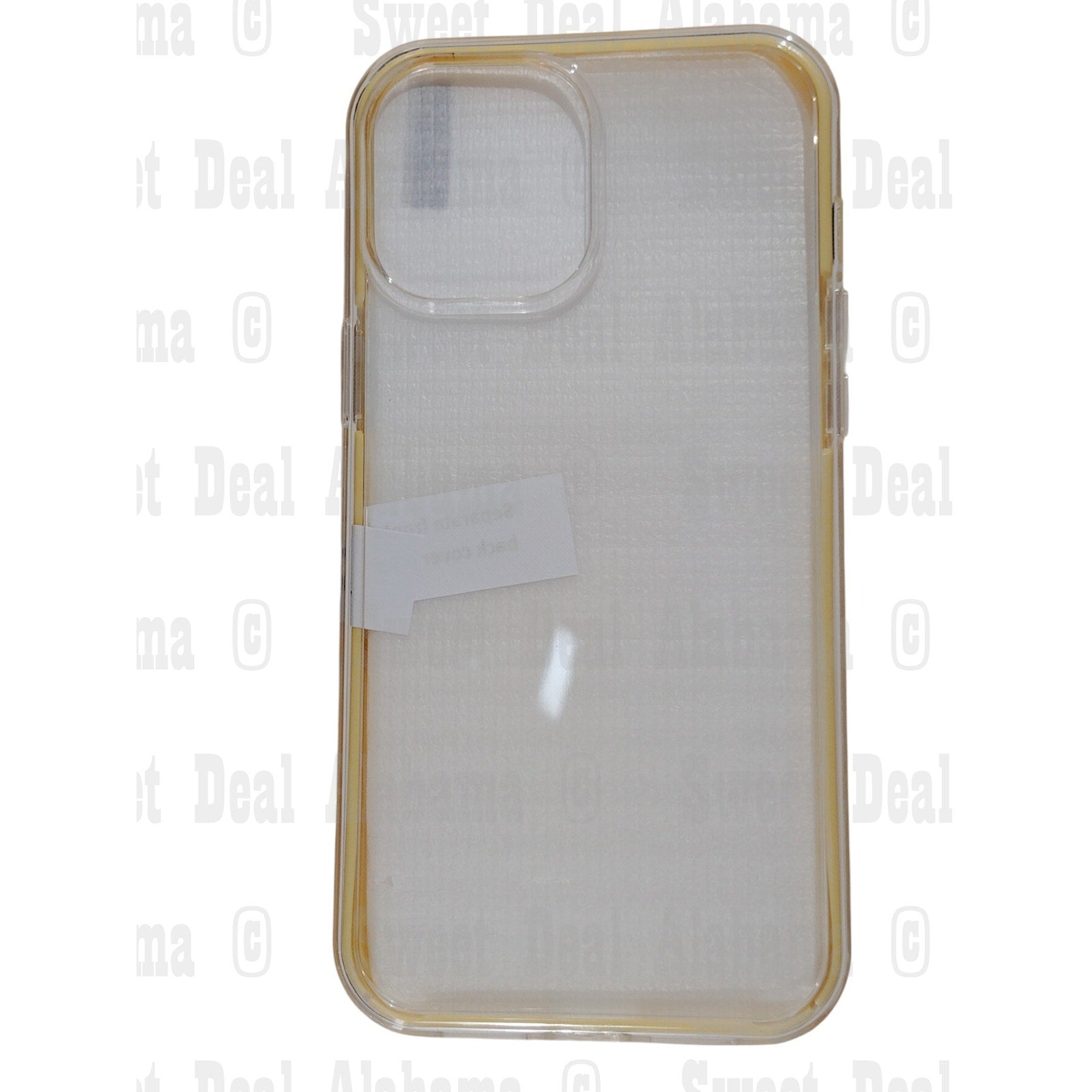 This Creative Cellphone Case is designed for the iPhone 12 Pro Max (6.7") and features a clear back panel with a yellow trim around the edges. The case maintains a slim profile while offering reinforced corners for impact resistance.