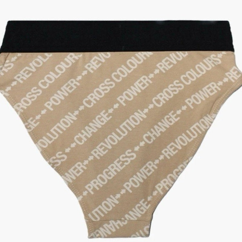 These Cross Colours women’s briefs in Nude feature the brand’s signature empowerment messaging with repeating text graphics including Power, Revolution, Progress, and Change. The soft stretch knit provides comfortable everyday wear, while the wide black waistband is embossed with the Cross Colours logo for a bold, iconic finish. A circular Cross Colours patch accents the hip. New and unused.