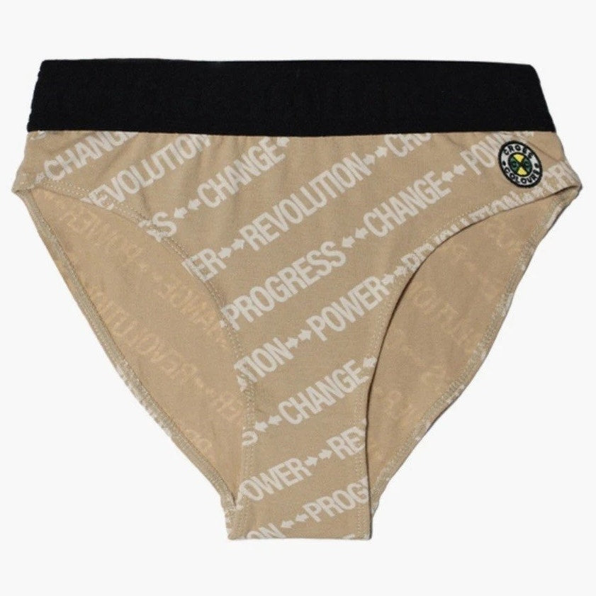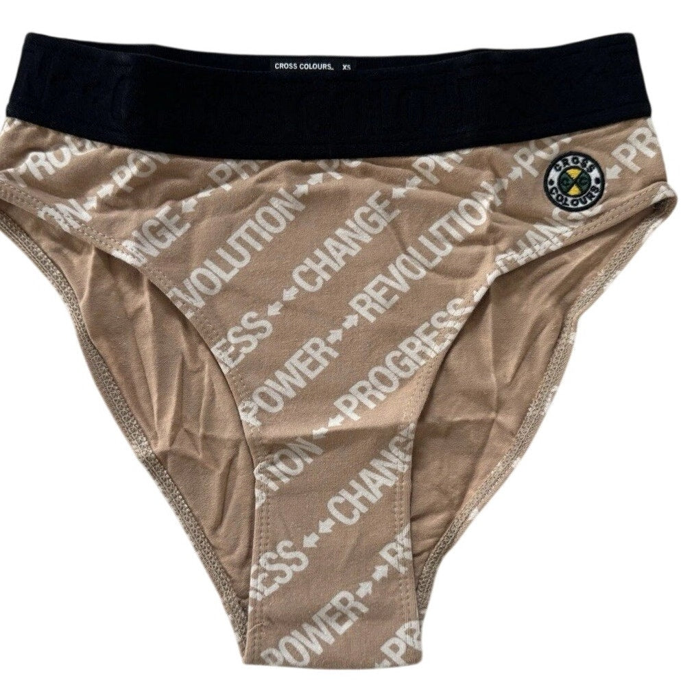 These Cross Colours women’s briefs in Nude feature the brand’s signature empowerment messaging with repeating text graphics including Power, Revolution, Progress, and Change. The soft stretch knit provides comfortable everyday wear, while the wide black waistband is embossed with the Cross Colours logo for a bold, iconic finish. A circular Cross Colours patch accents the hip. New and unused.