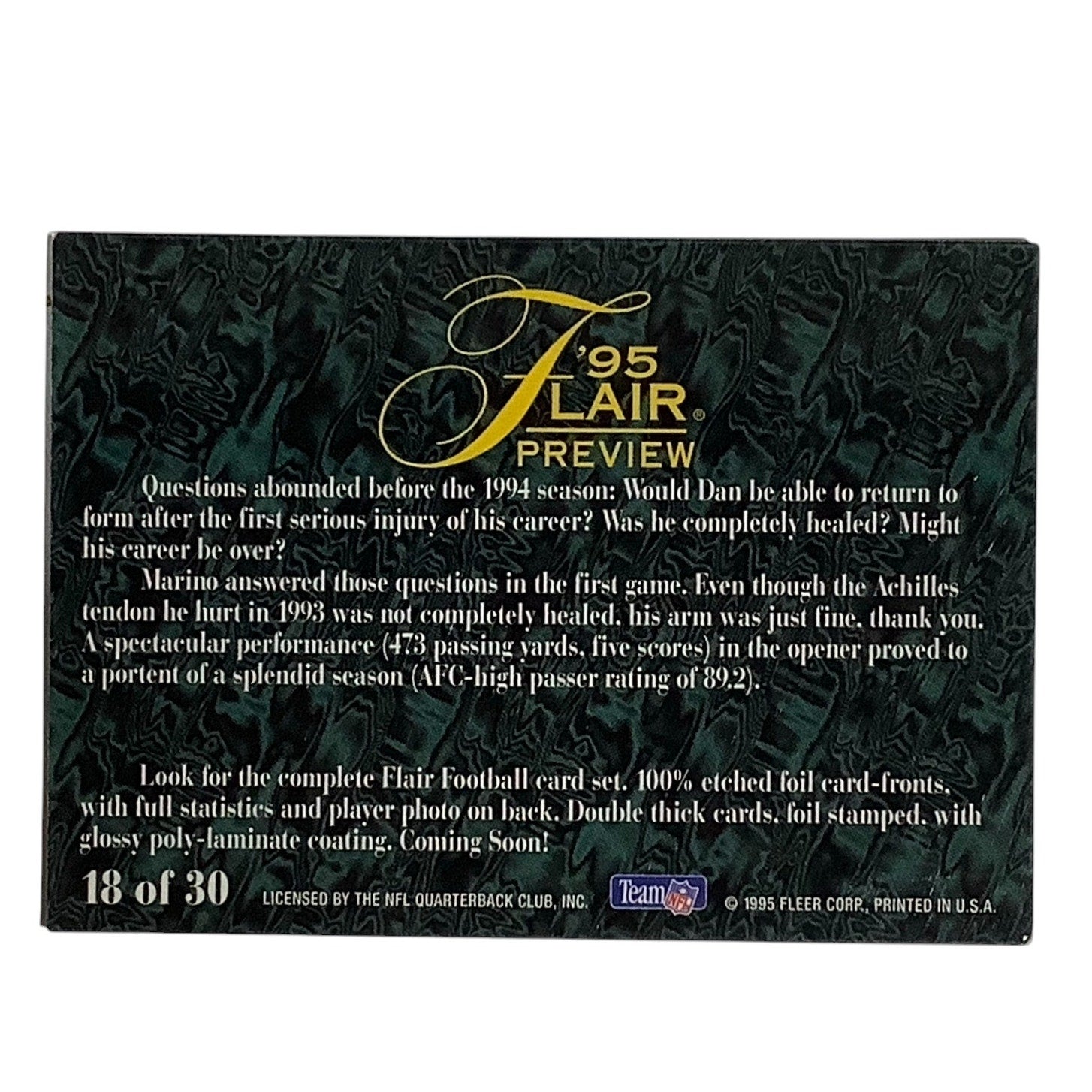 Dan Marino, Miami Dolphins, NFL Fleer 95 Flair Preview, 1995 Card 18, EX/NM