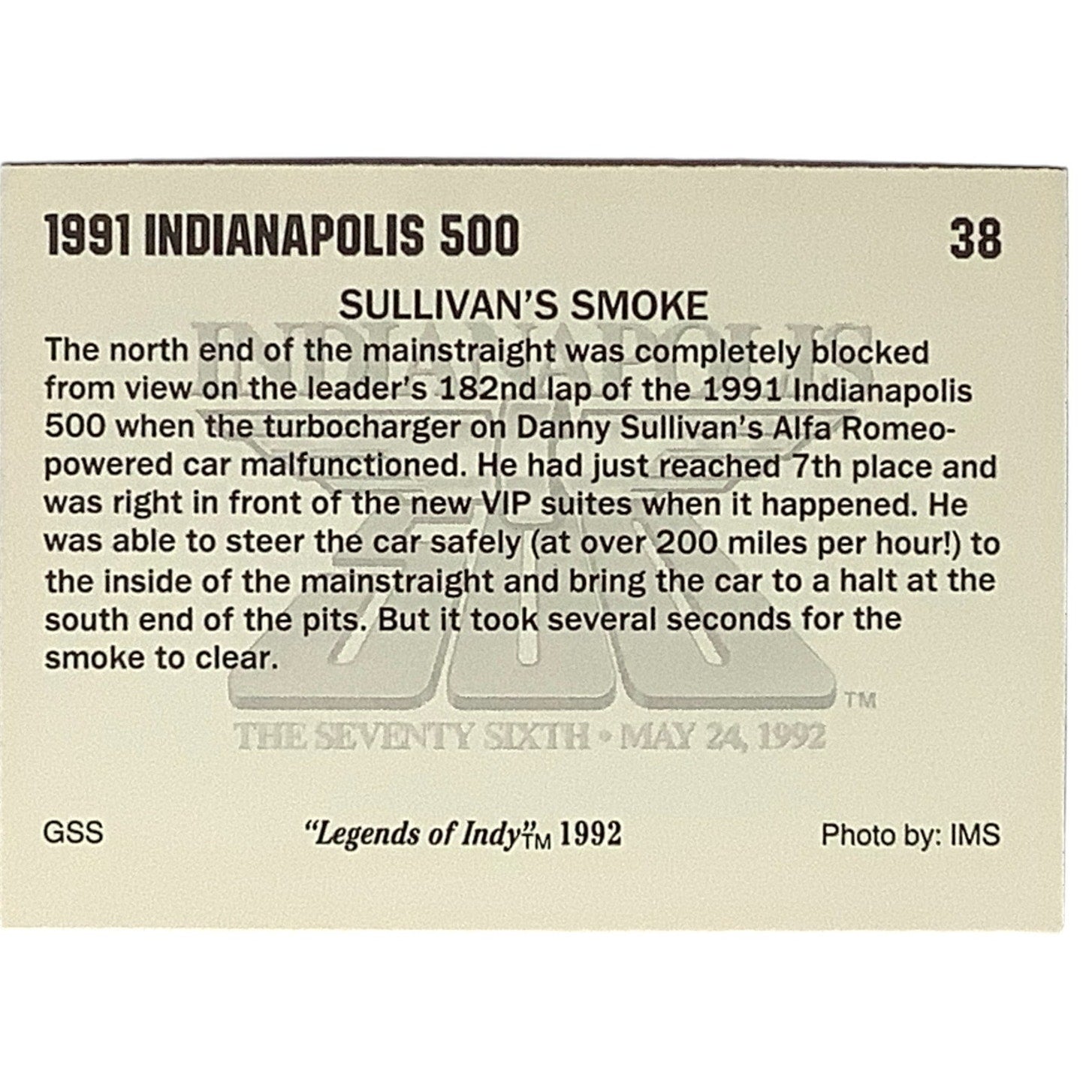 Danny Sullivan's Smoke -Lap 182, 1991 Action, 1992 Legends of Indy, Card 38, NM+