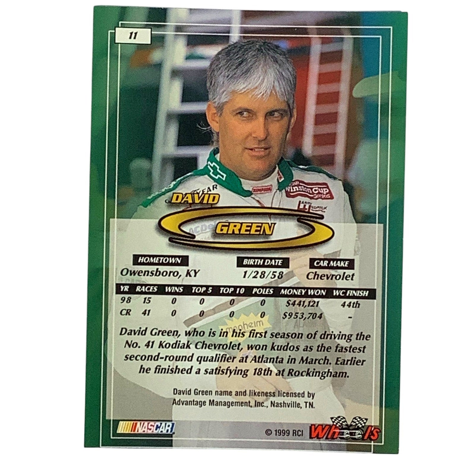 David Green, Sponsor: Kodiak, Card 11, 1999 Wheels NASCAR Winston Cup, NM+