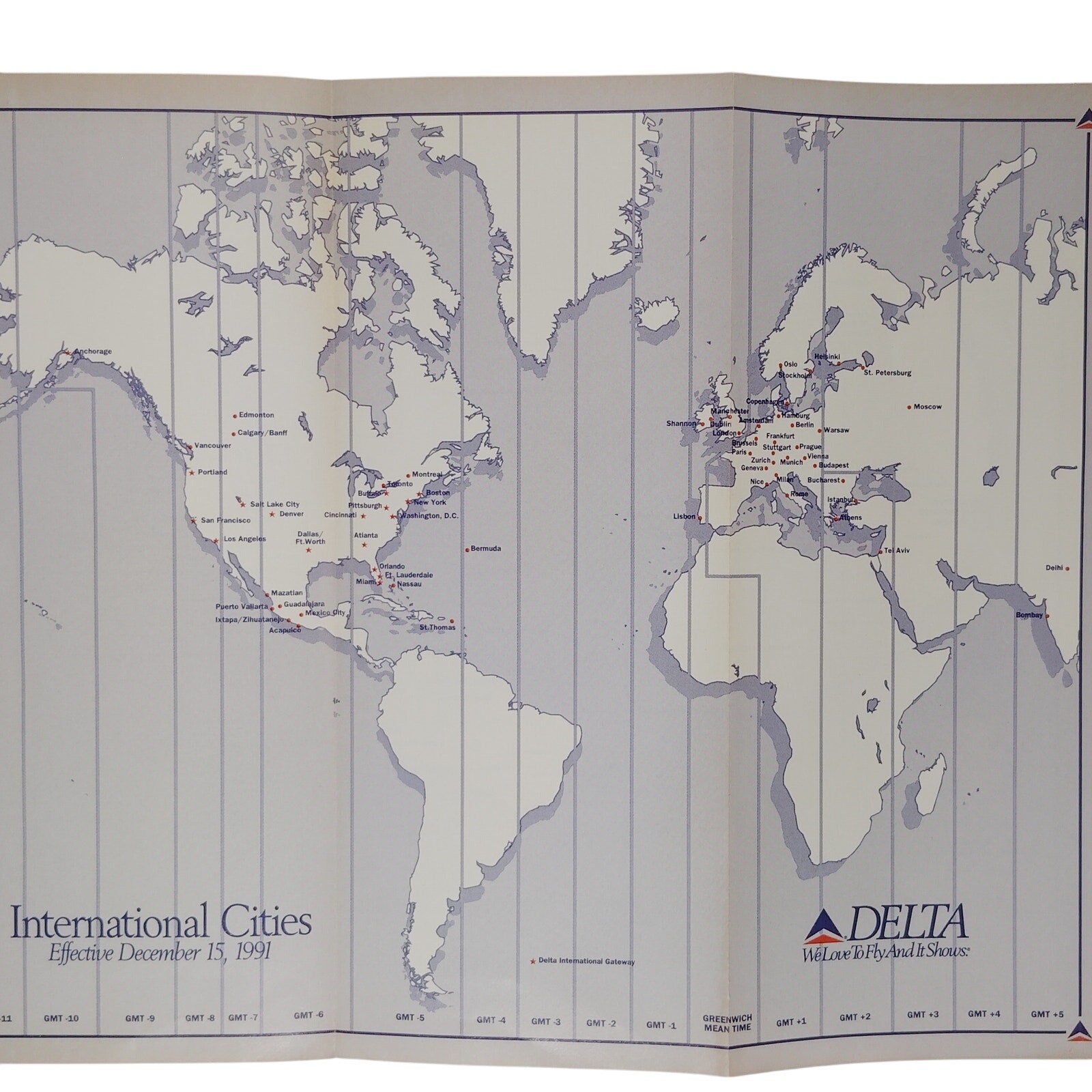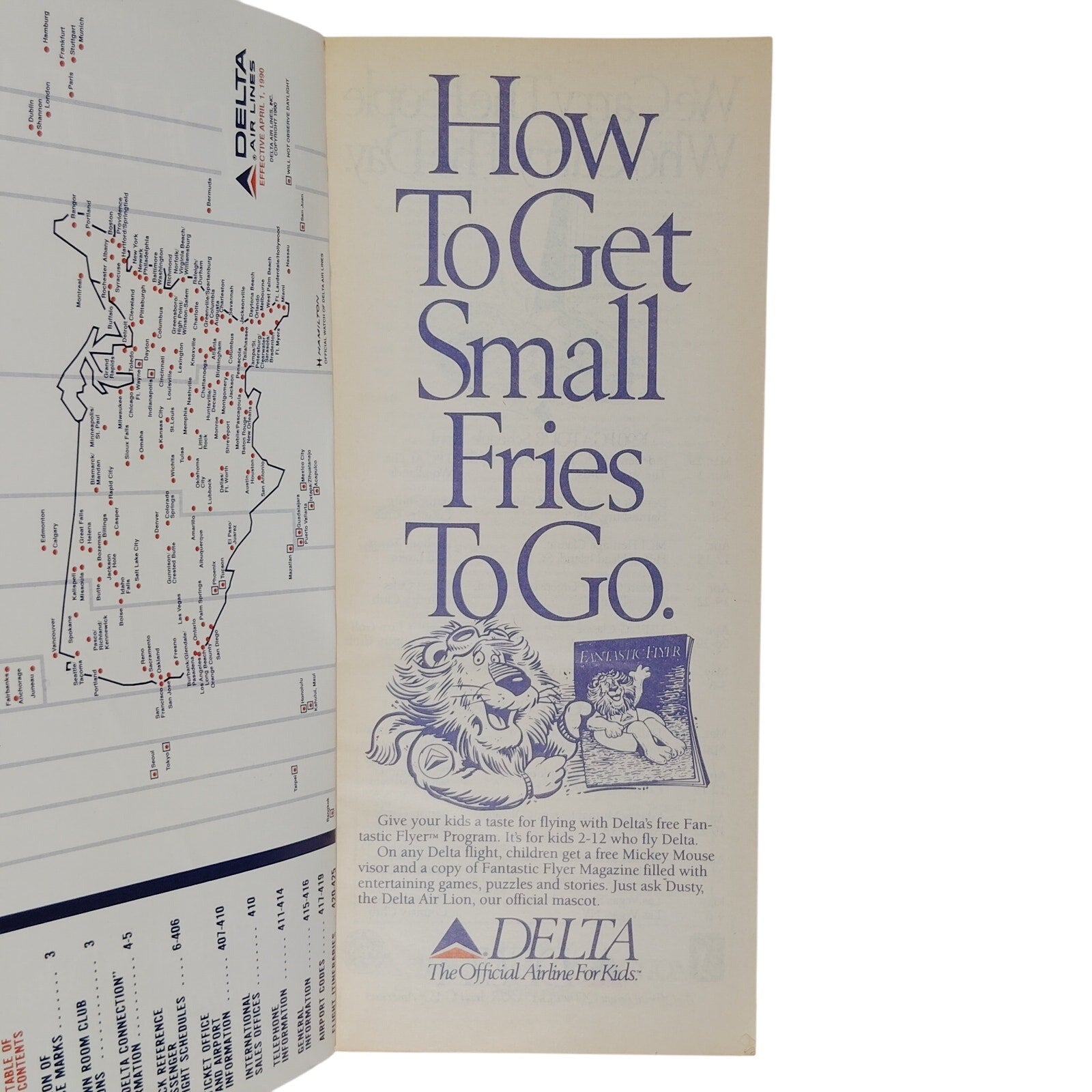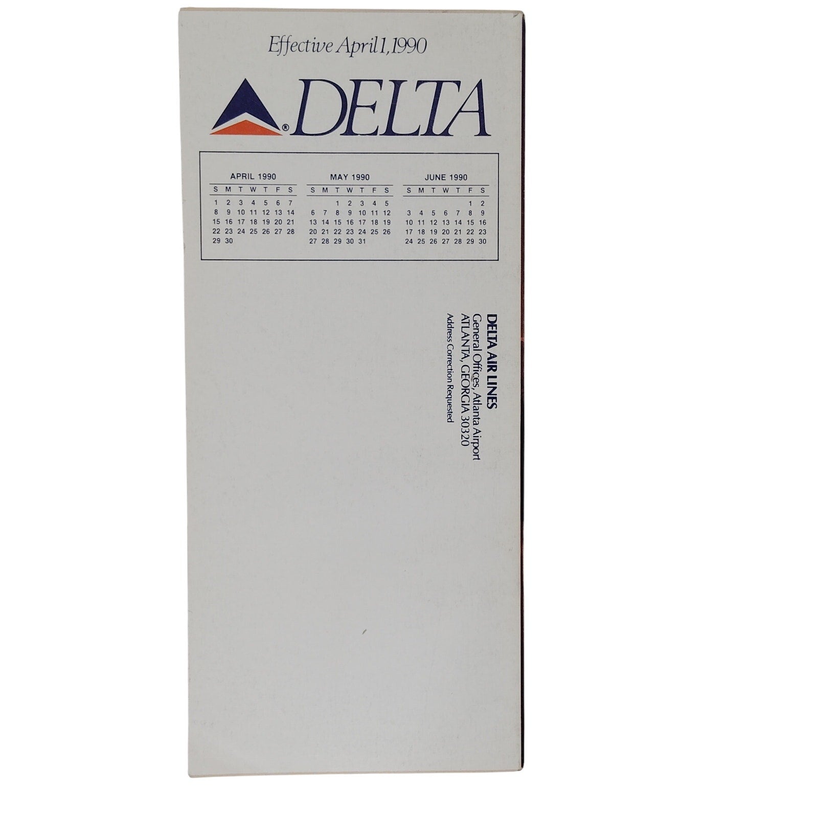Delta Air Lines system timetable effective April 1, 1990. Cover features a snow-capped mountain reflected in water with the caption “Discover Alaska On Delta. Anchorage, Juneau, Fairbanks.” Includes 425 pages of flight schedules, route maps, aircraft types, and ads. Map insert is present but detached from booklet. Part of Delta’s printed timetable series issued from 1934 to 2004. A vintage collectible ideal for aviation and travel ephemera collectors.